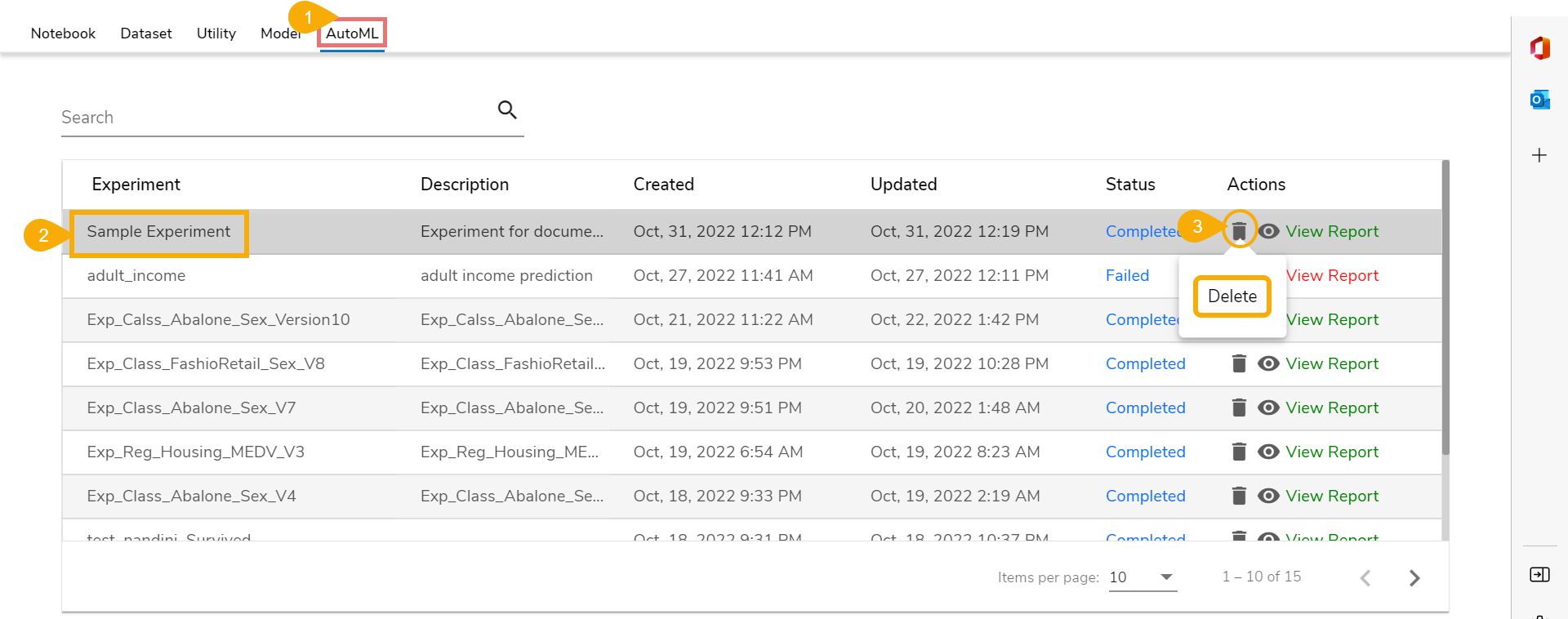 *<mark style="color:green;">Please Note:</mark>* *The user can remove any Auto ML experiment irrespective of its status.*