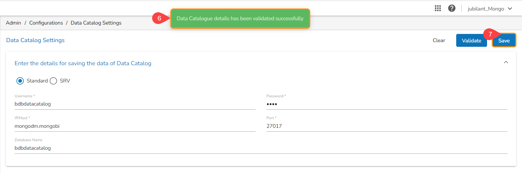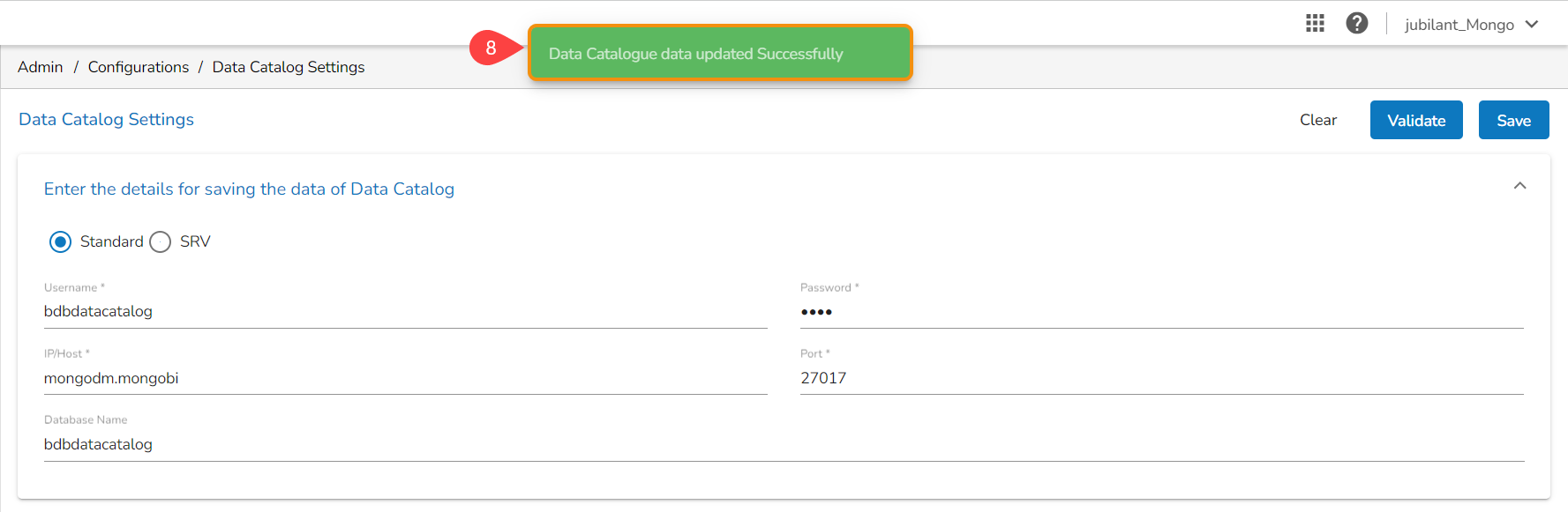 A notification message appears to confirm that the Data Catalog Settings have got saved.