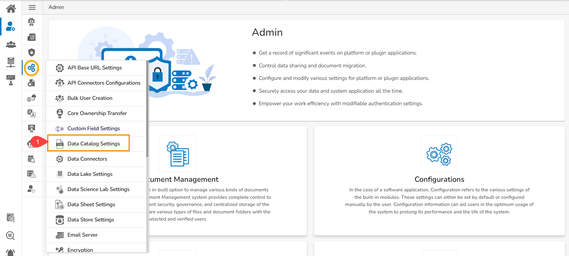 The admin can configure the details of the Data Catalog that needs to be saved. This settings option is essential for using the Data Catalog search feature.