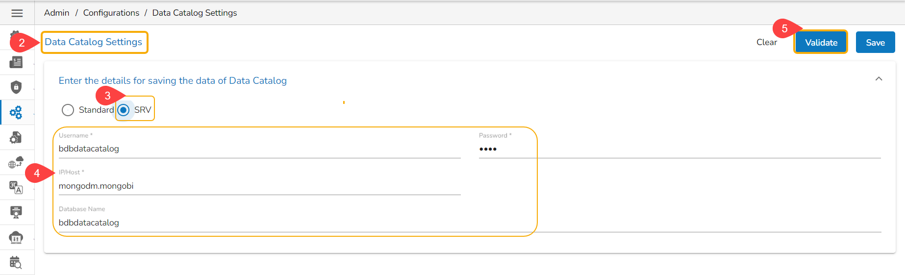 Fields when SRV option is selected to save the Data Catalog Settings: