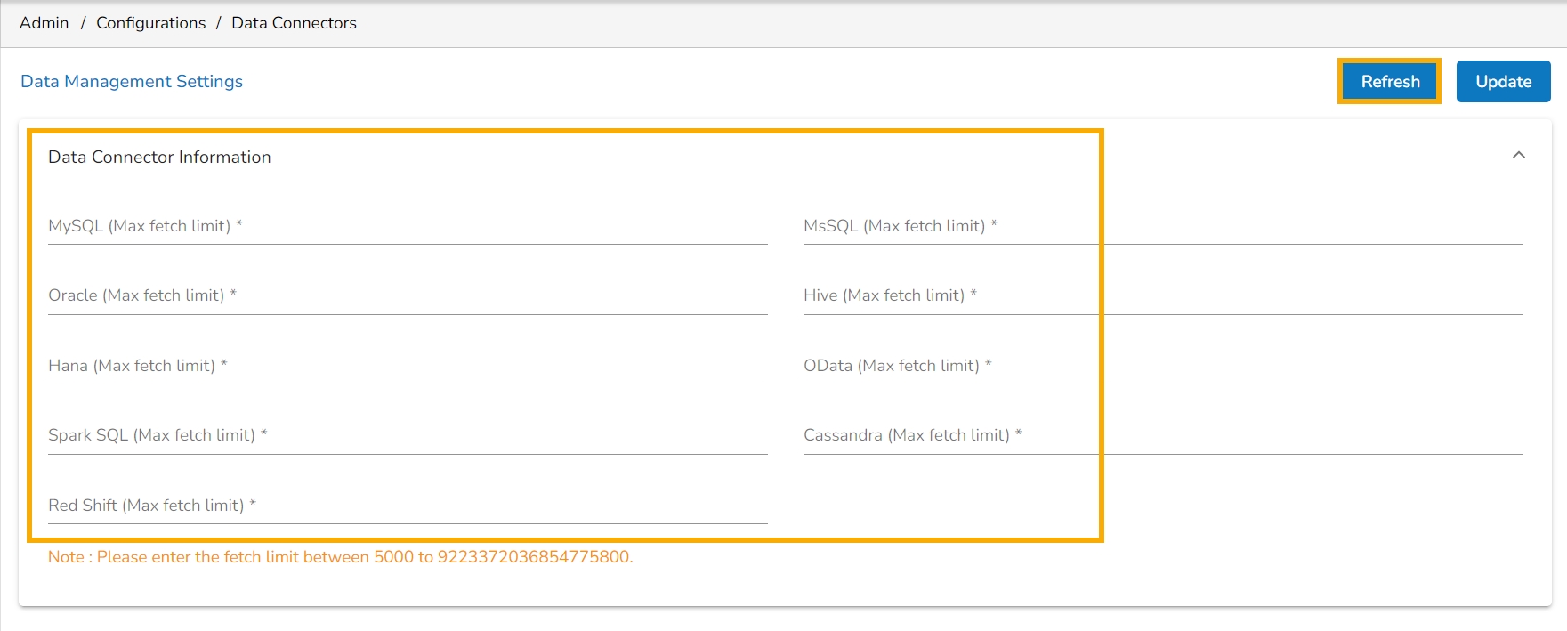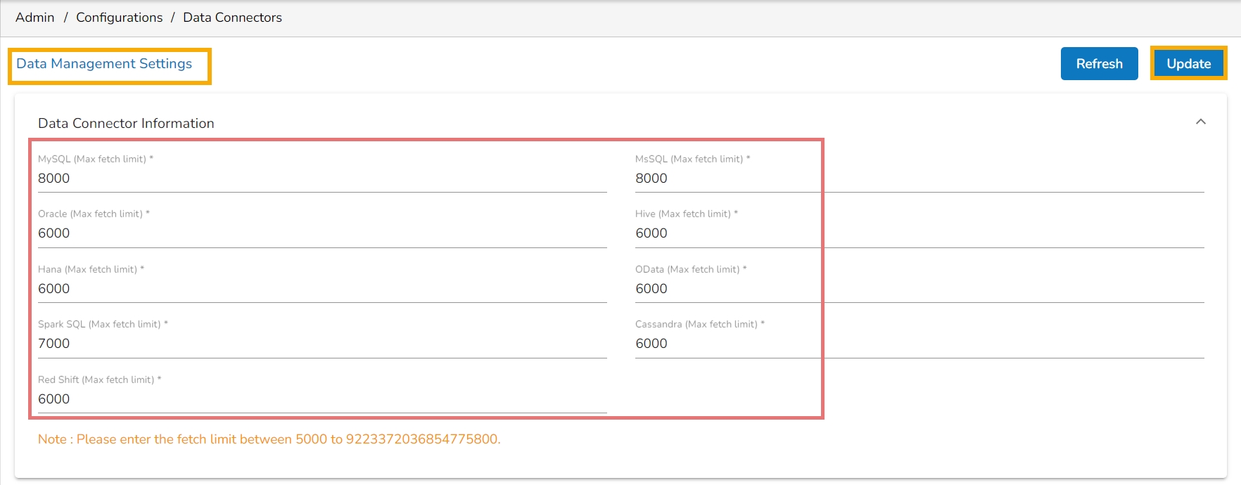 Click the Update option to save the entered Max Fetch Size for data.
