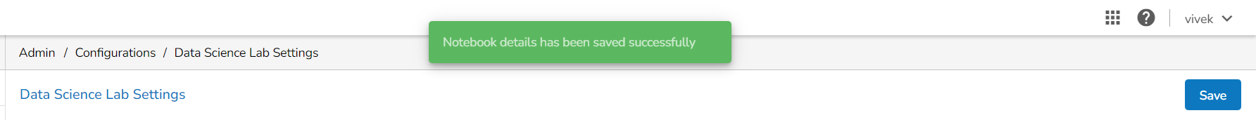 A notification message appears to confirm that the provided configuration for the Notebook Settings has been saved.