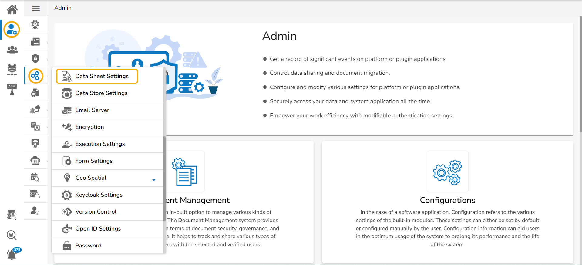 The Data Sheet Settings option helps the administrator to configure the Data Sheets templates.