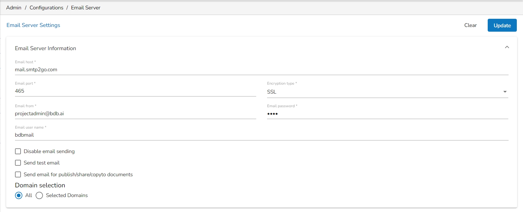 The administrator can configure the email server information using this admin option to get email alerts for new Forms and Business Story alerts.