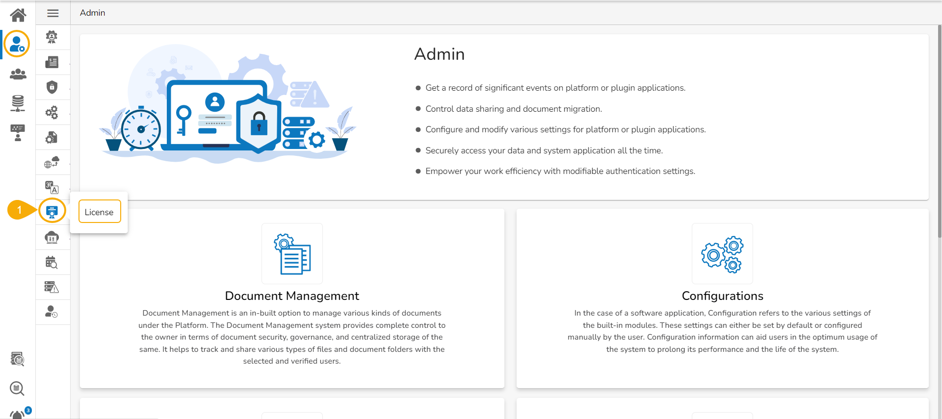 The License admin option provides information about the user license and allows the administrator to perform the License-related settings with the help of the BDB support team.