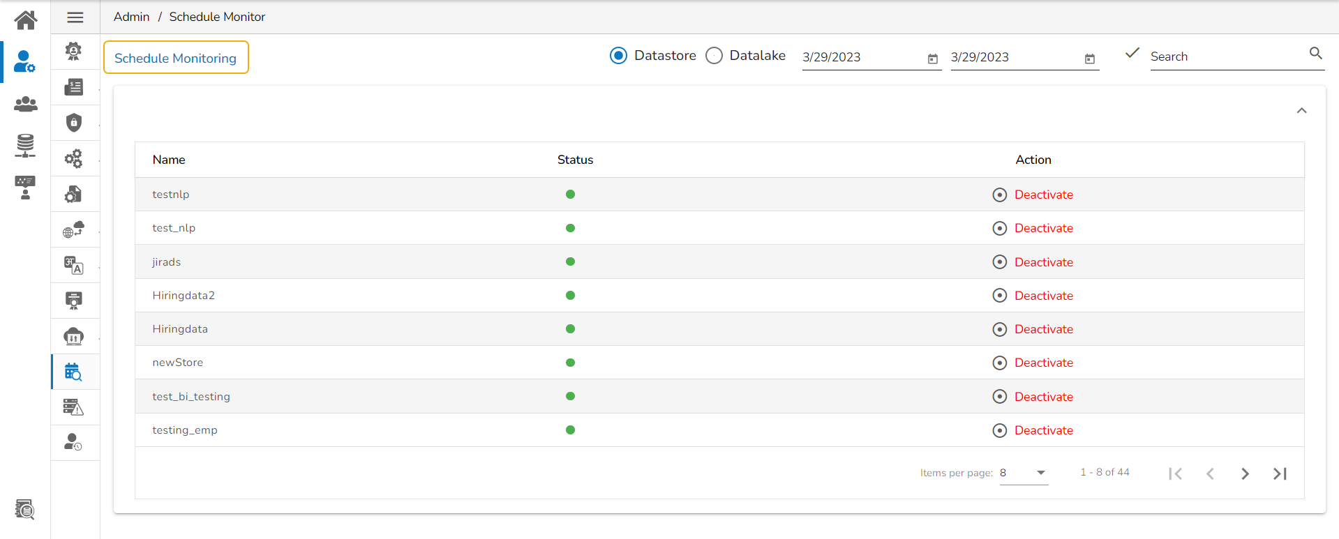The Schedule Monitoring page appears with a list of data stores displaying their current Status and Action.
