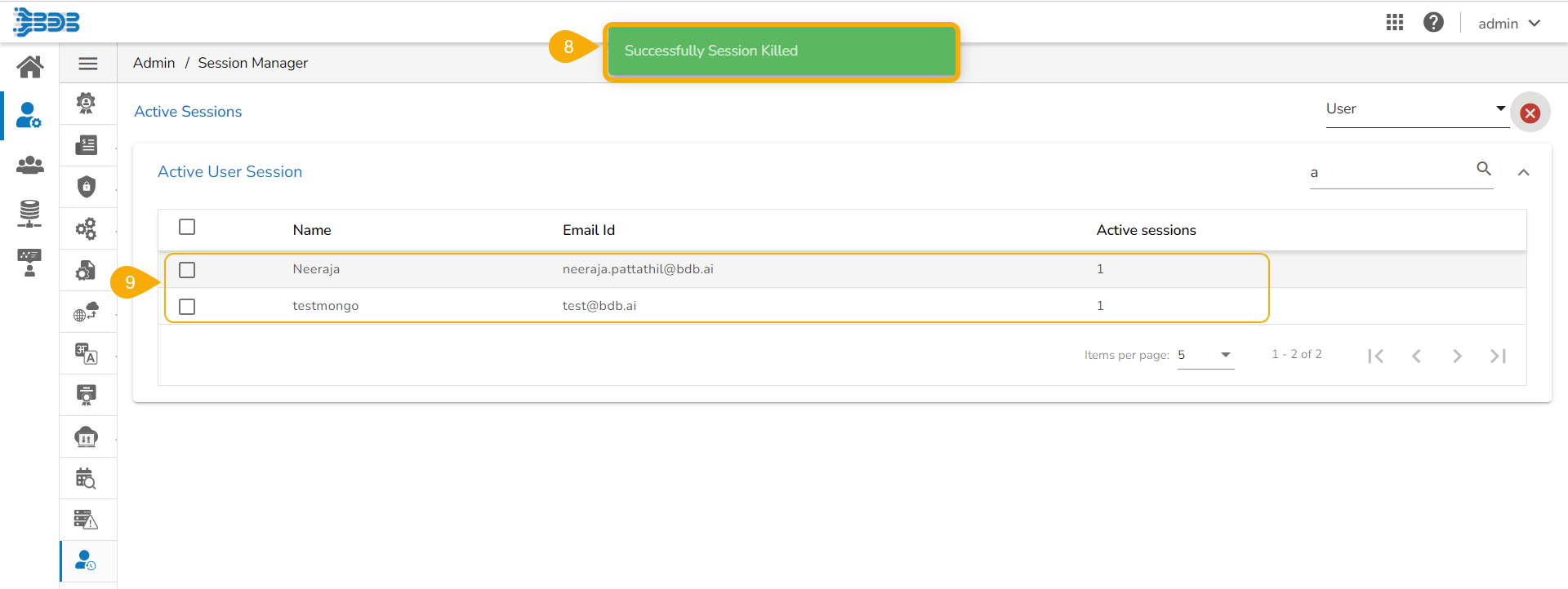 Users to whom the Kill Session option has been applied log out of their sessions without any notification. The users need to log in again to the BDB platform.