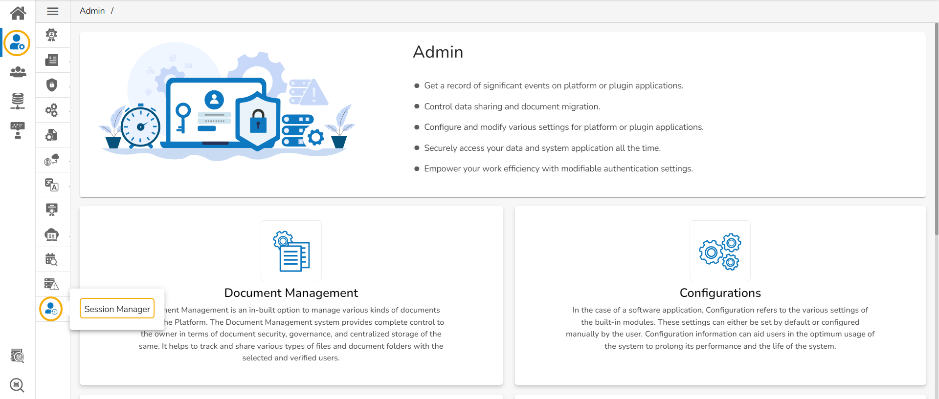 The Session Manager is an administrative module to display the various status of the platform users.