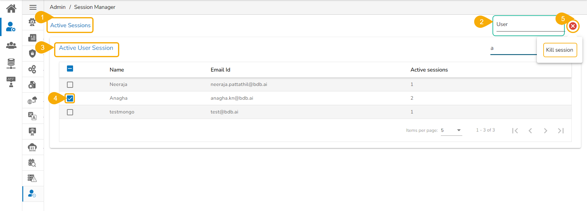Use the Search bar to search a specific user(s) from the displayed list of Active Sessions.