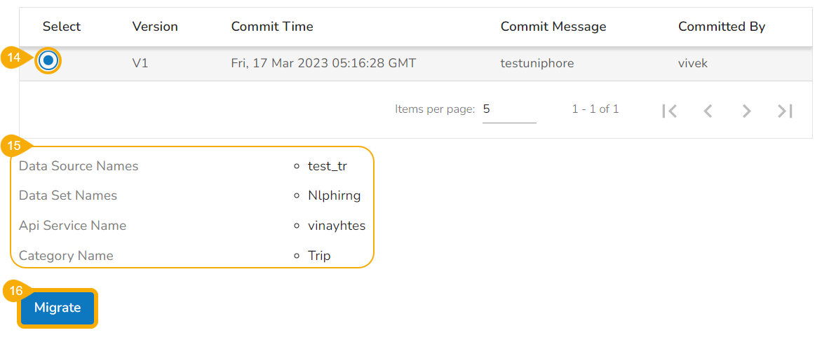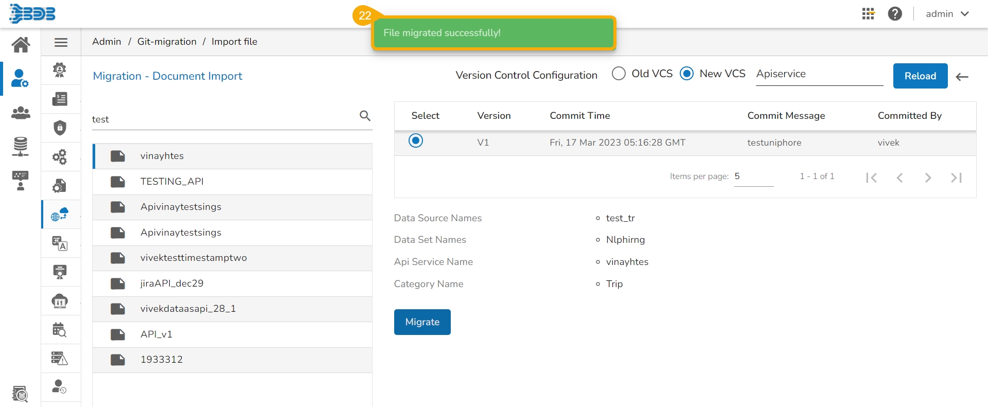 A notification message appears, and the selected API Service gets migrated to the Data Center module.