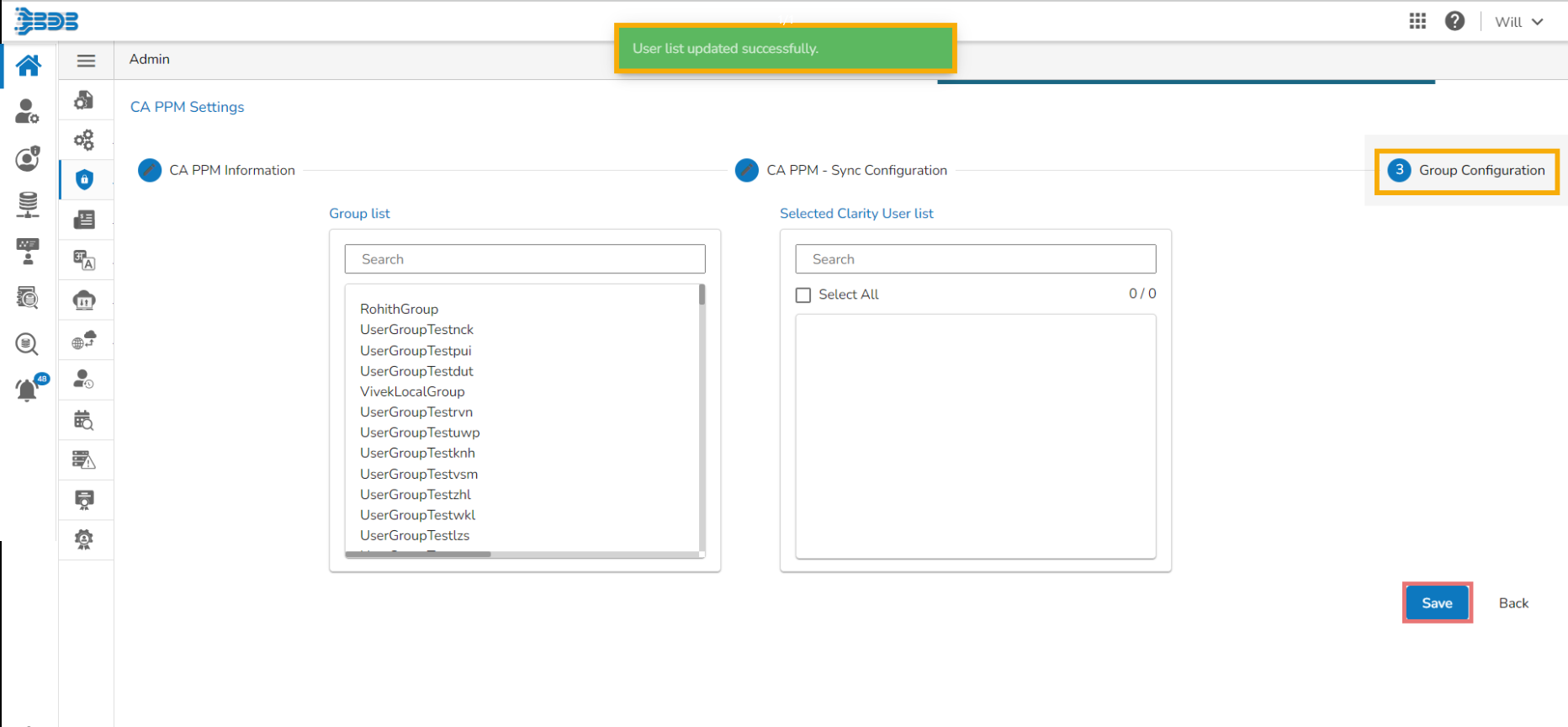 The CA PPM Sync Configuration tab opens, displaying the Clarity User list.