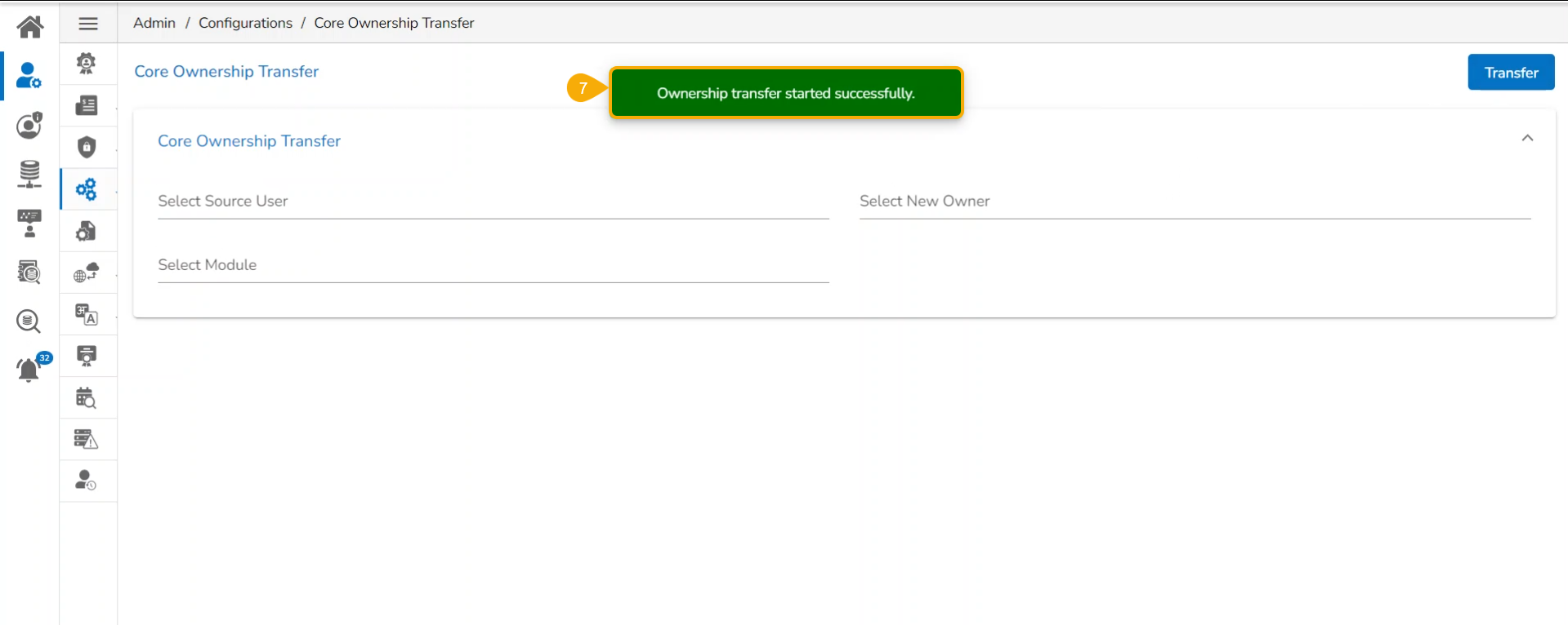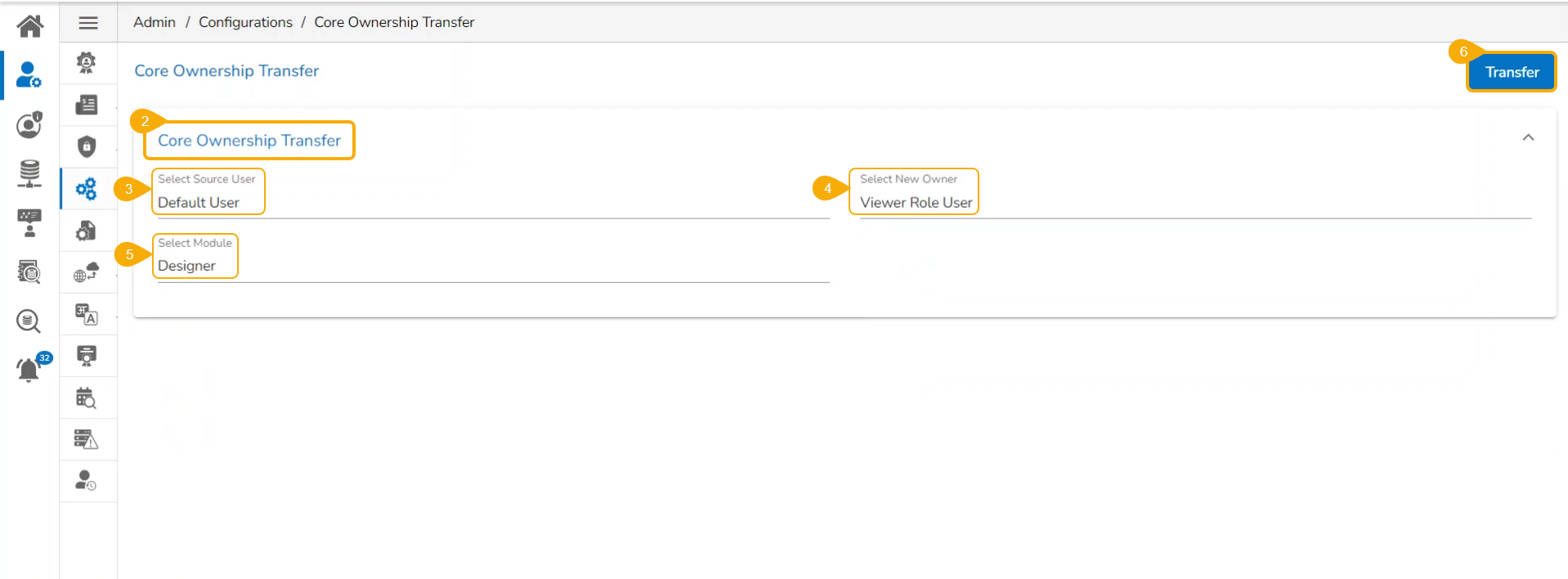 The Core Ownership Transfer Settings allows to transfer all the components of Data Center, Designer, Security, Home, and Pipeline modules from one user to another user.