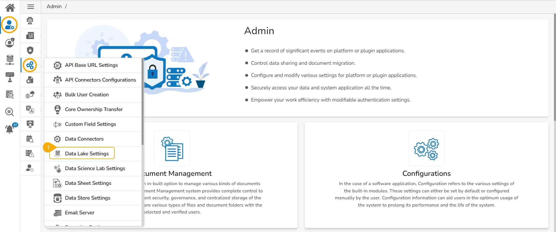 Accessing the Data Lake Settings option The Data Lake Settings form opens.