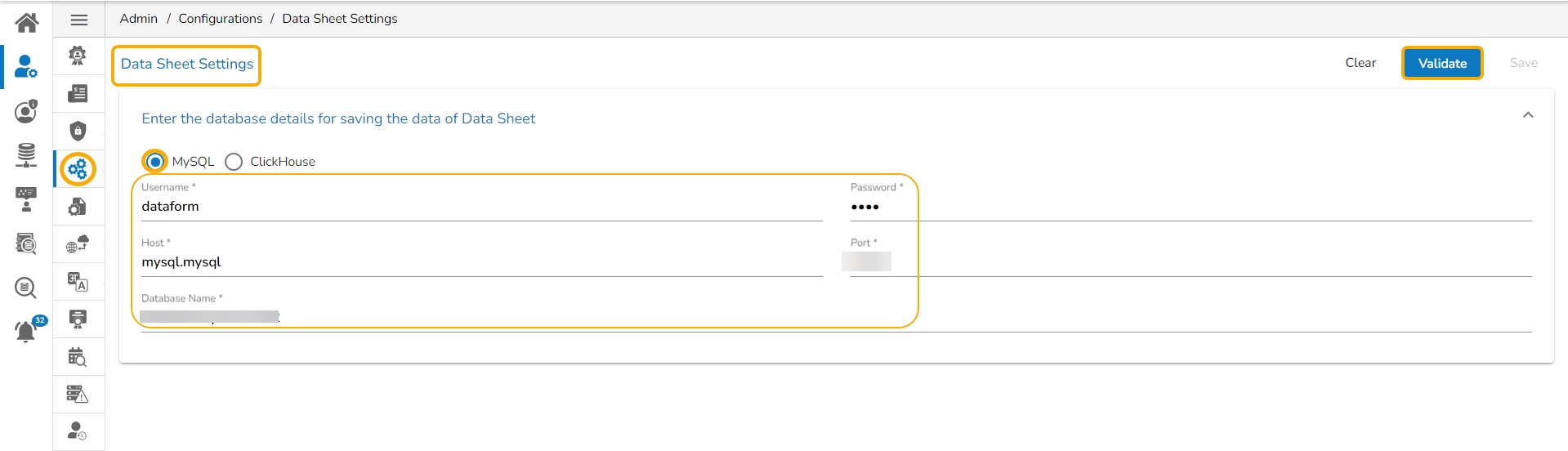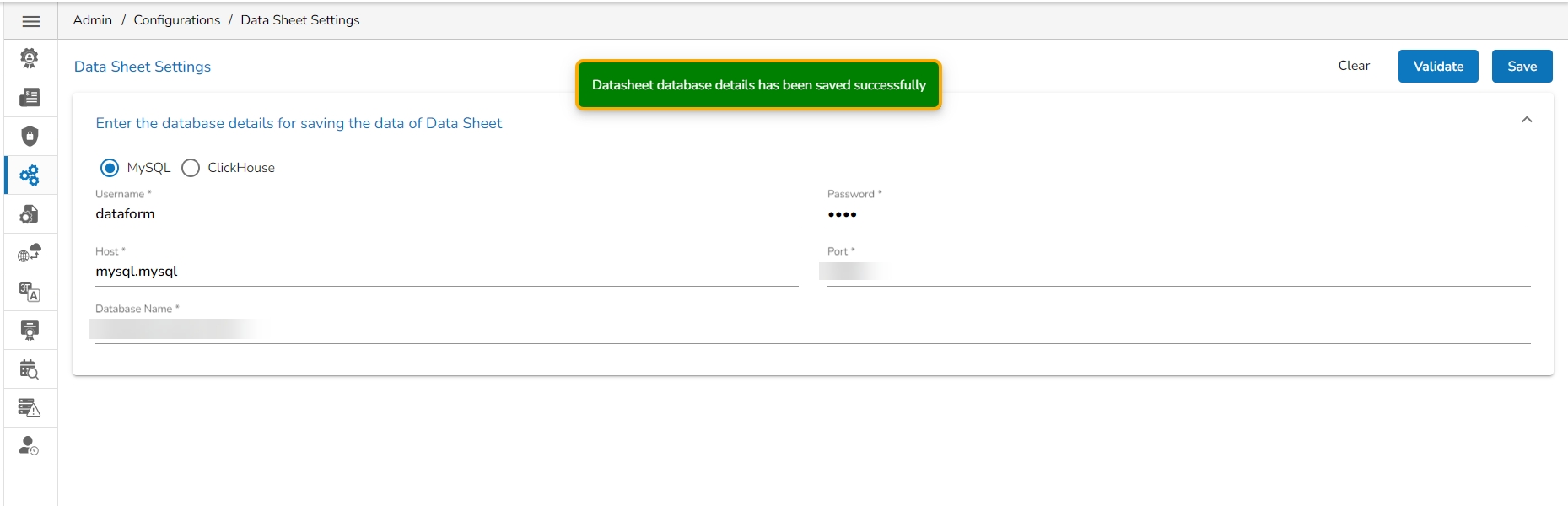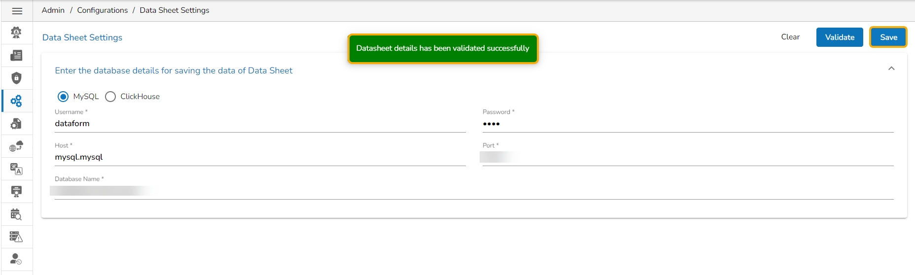Enter the database details to save the Data Sheet data as mentioned below: