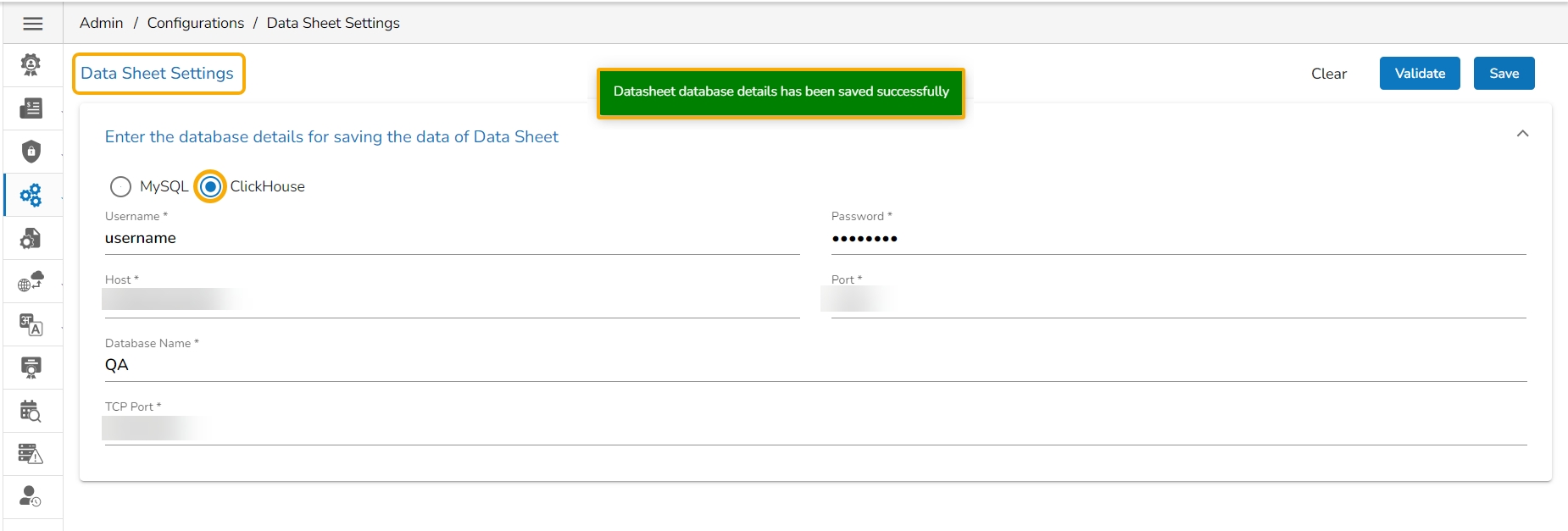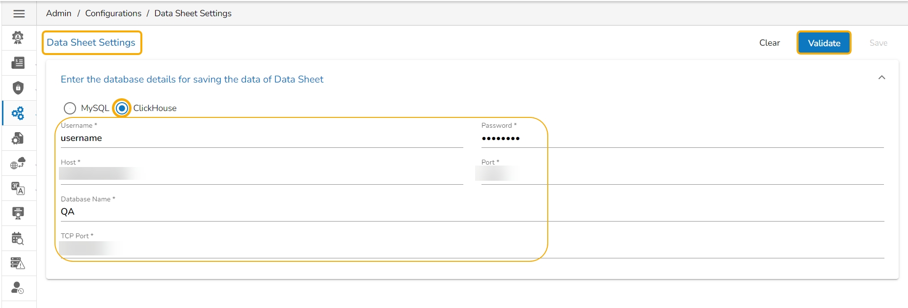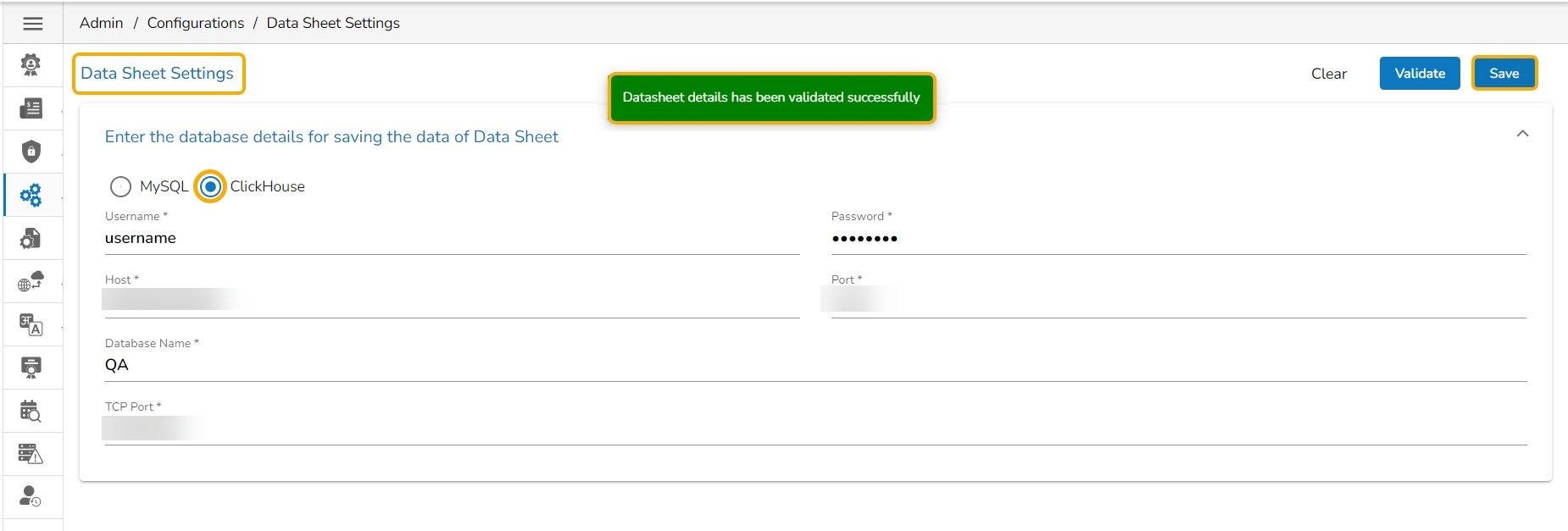 The user can follow the same set of steps to configure the Data Sheet Settings with the ClickHouse option.