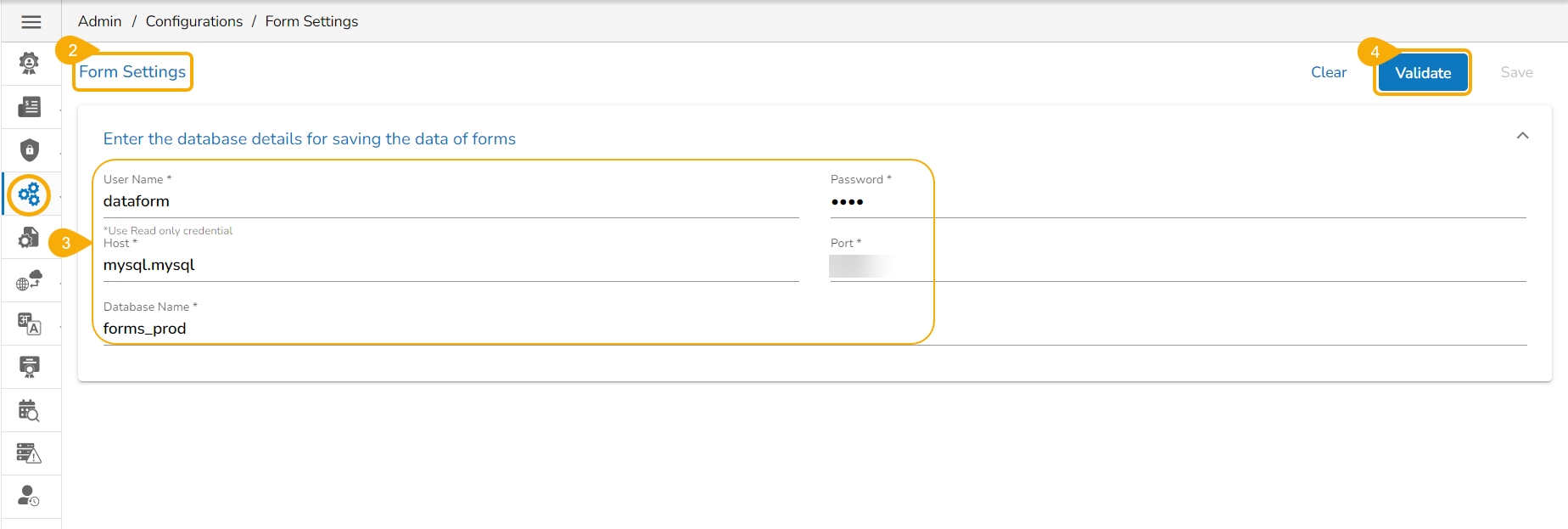 The Form Settings admin option provides database details for saving the data of forms. This configuration option is a prerequisite to use the Forms module.