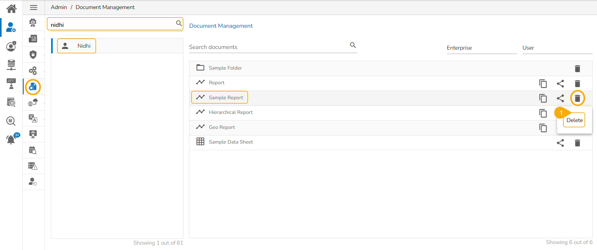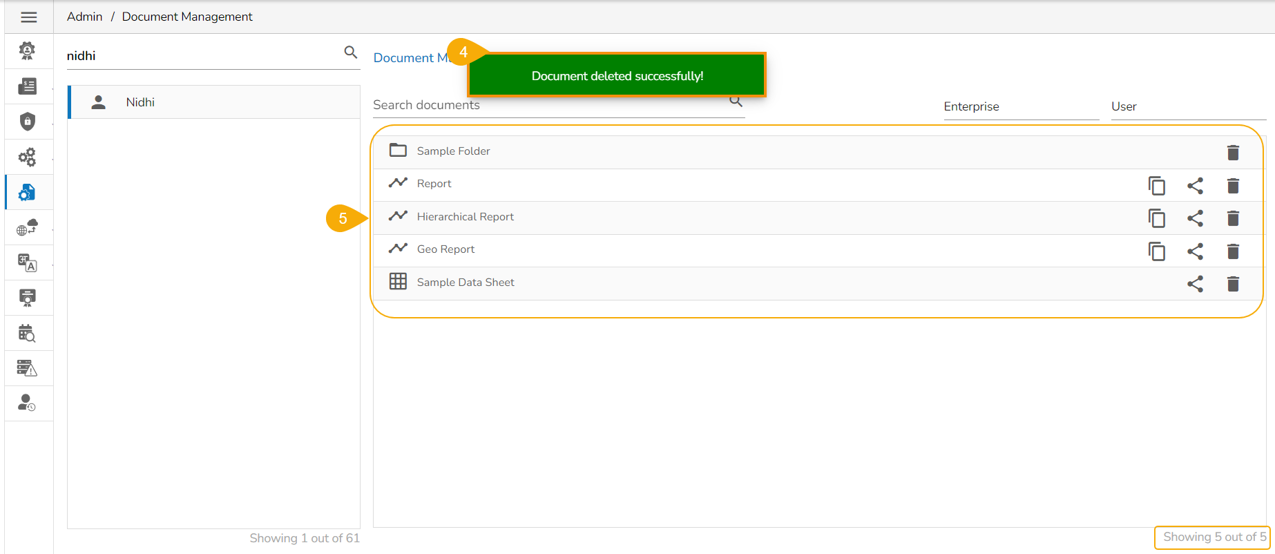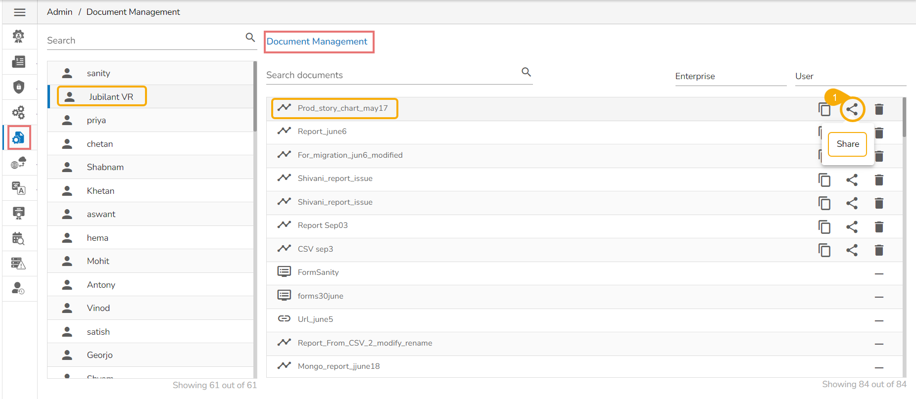 This feature allows an administrator to view all the user-specific documents. The administrator can share or delete user-specific documents via this module. The Document Management tile appears in the Administration module.