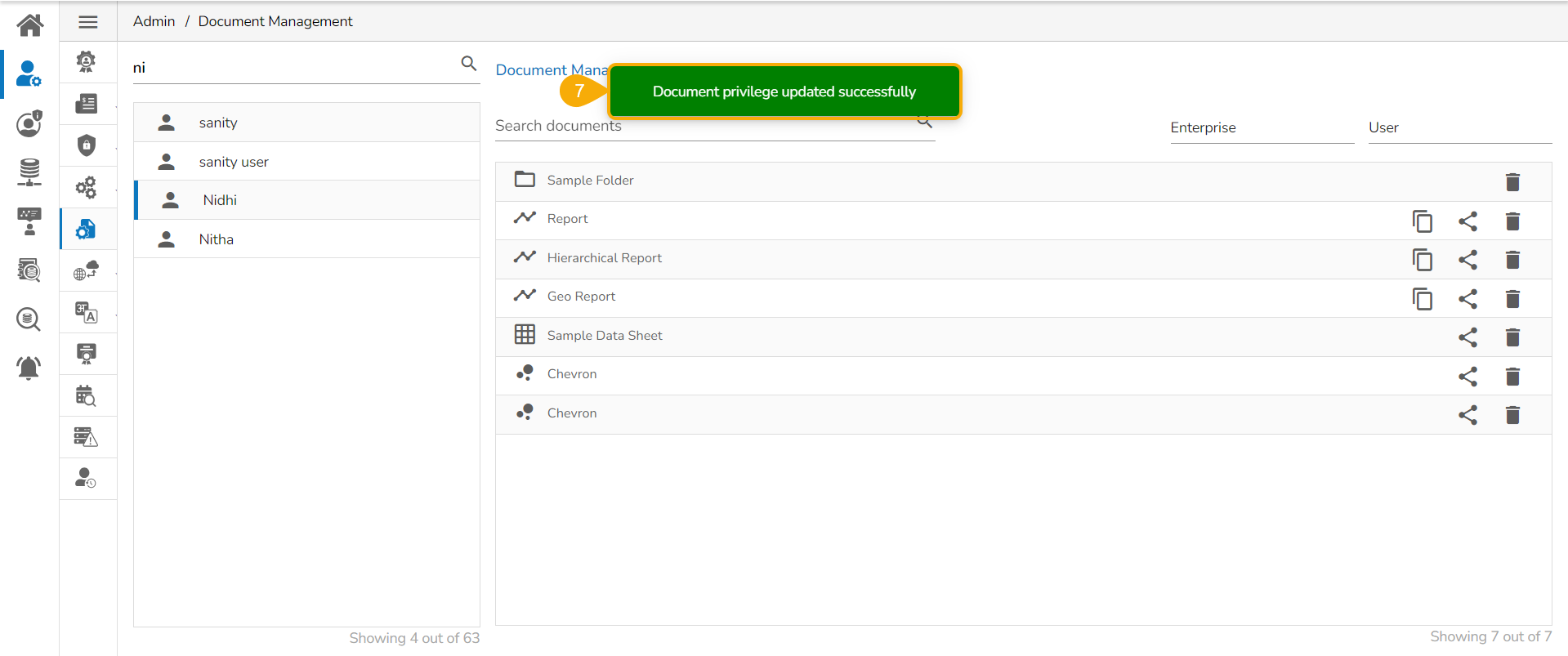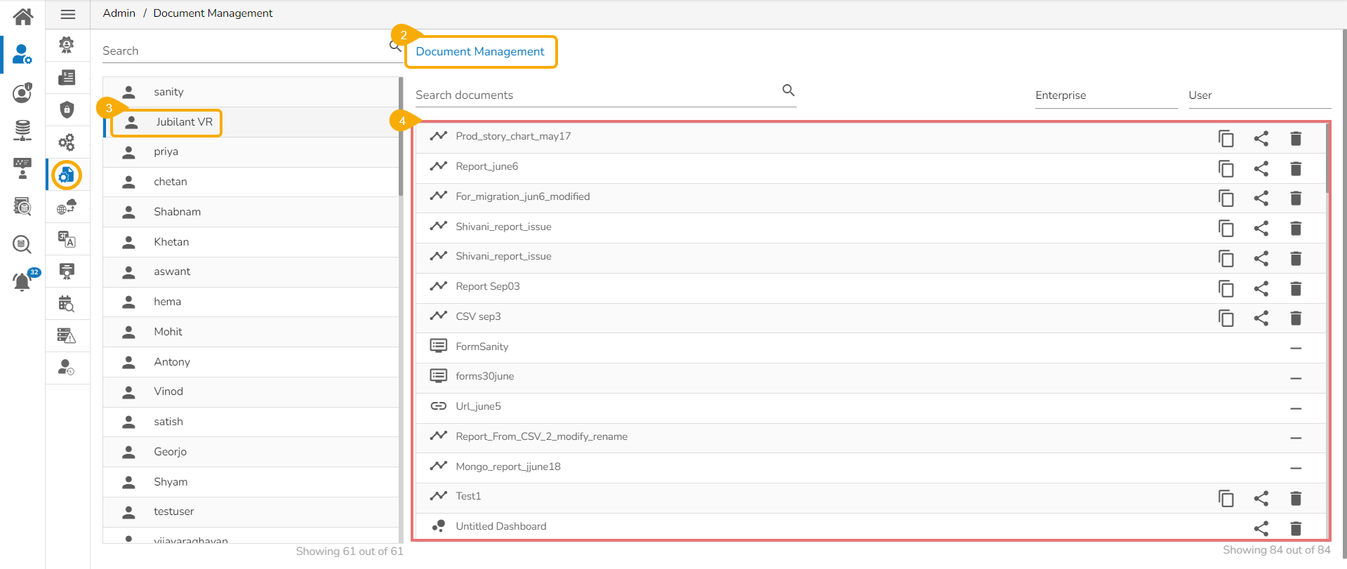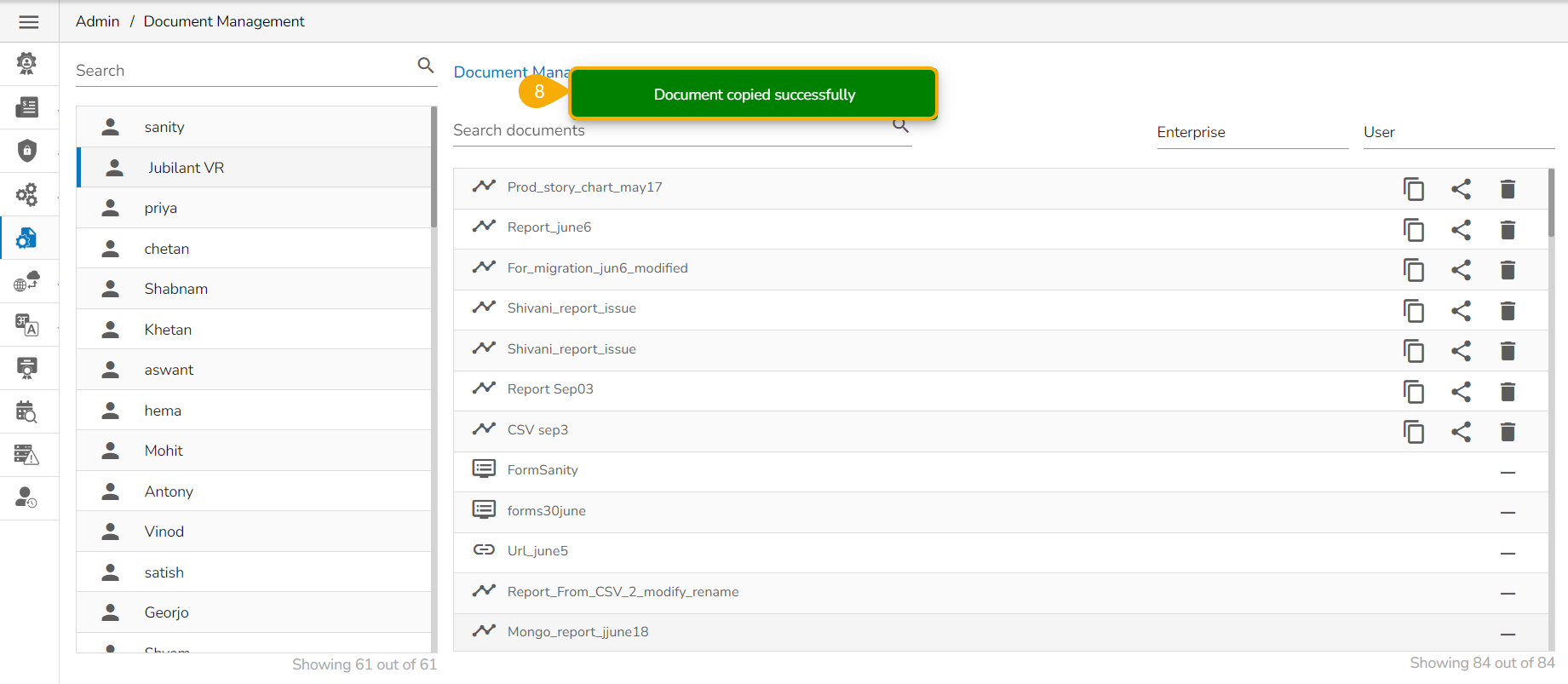 This feature allows an administrator to view all the user-specific documents. The administrator can share or delete user-specific documents via this module. The Document Management tile appears in the Administration module.