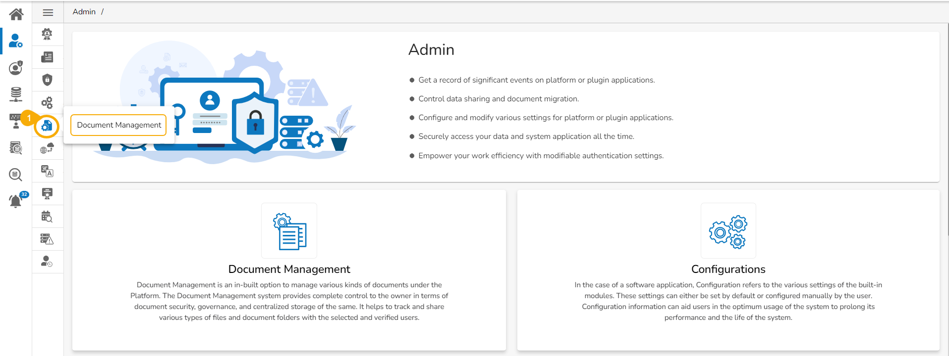 Accessing the Document Management option from the Admin menu The user gets directed to the Document Management window.