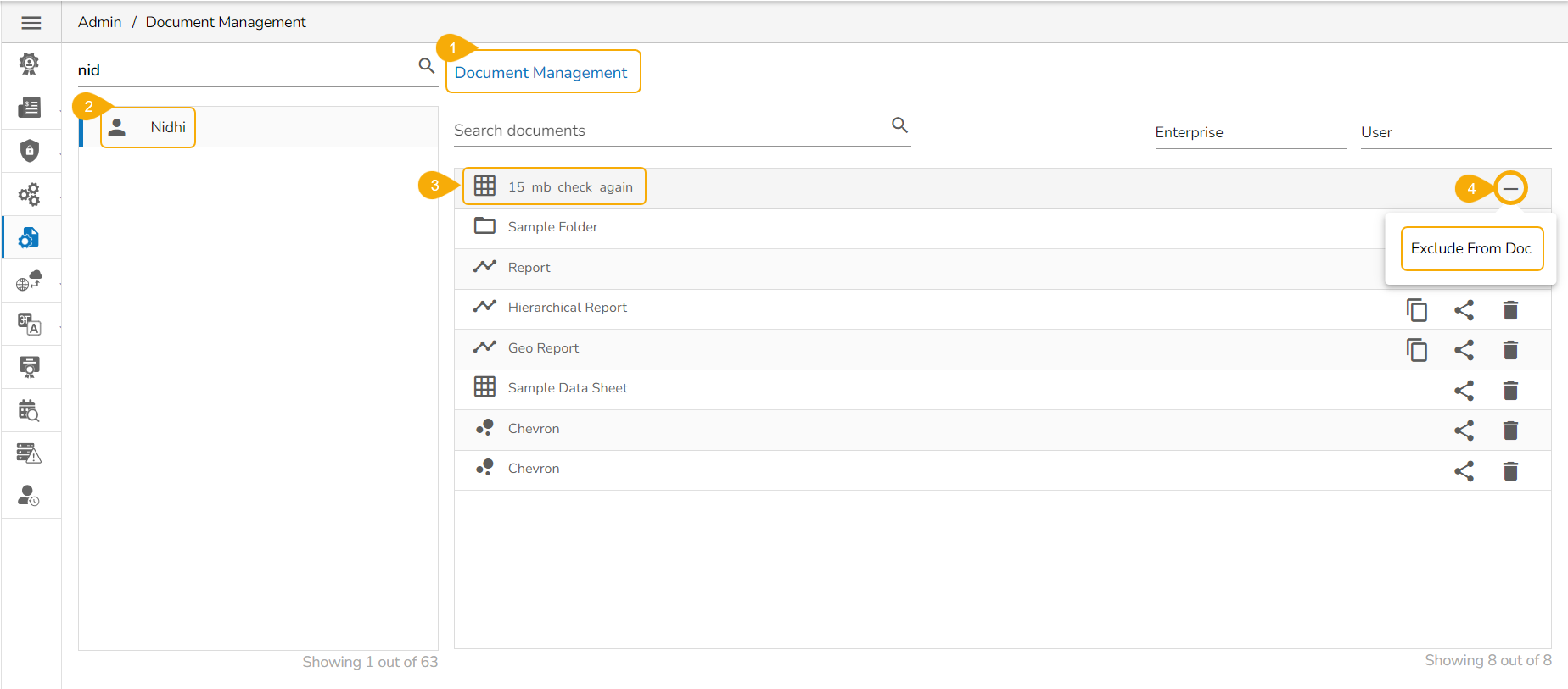 Users will get the Exclude From Doc option for all the shared documents. The admin can exclude these document from the ueser se shared documents can be excluded from the Document Management list using the Exclude Document option.