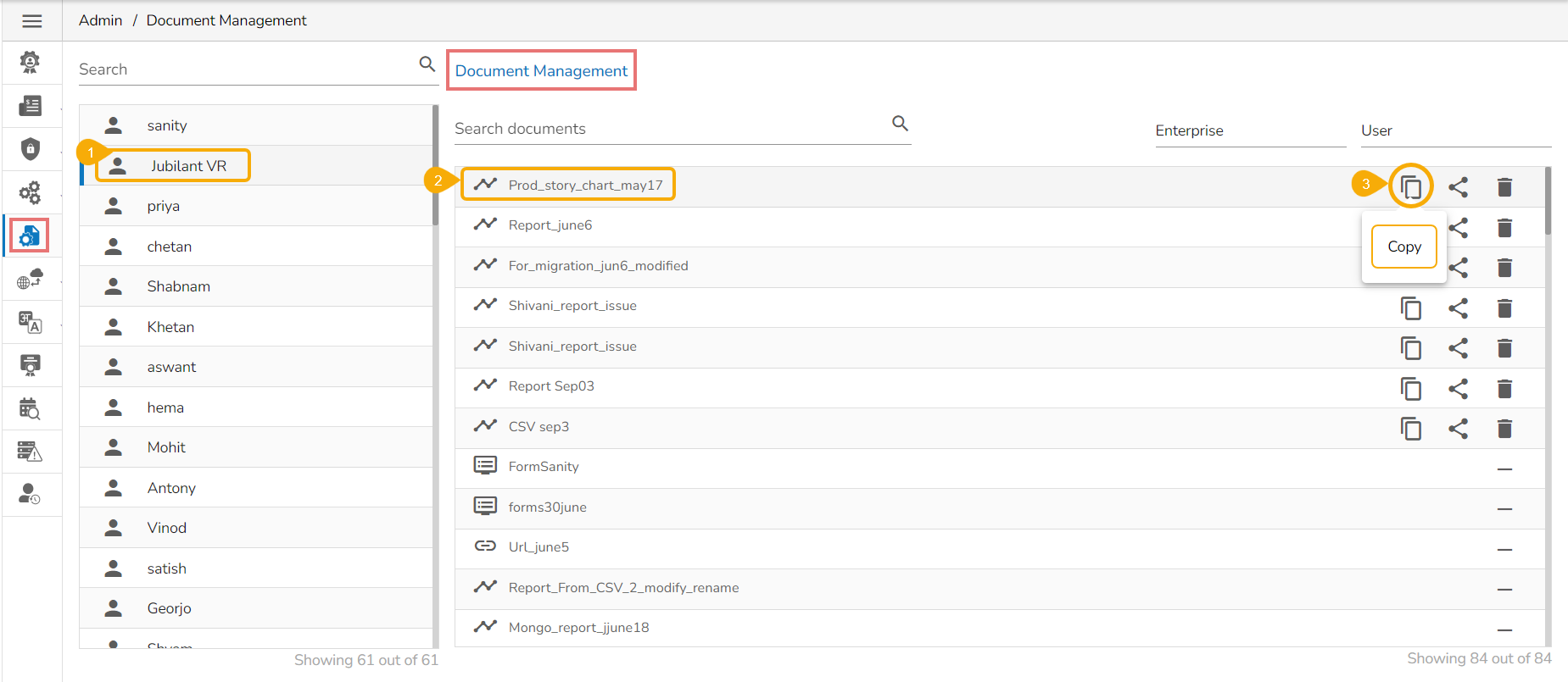 Click the Copy icon for a document from the document management list.