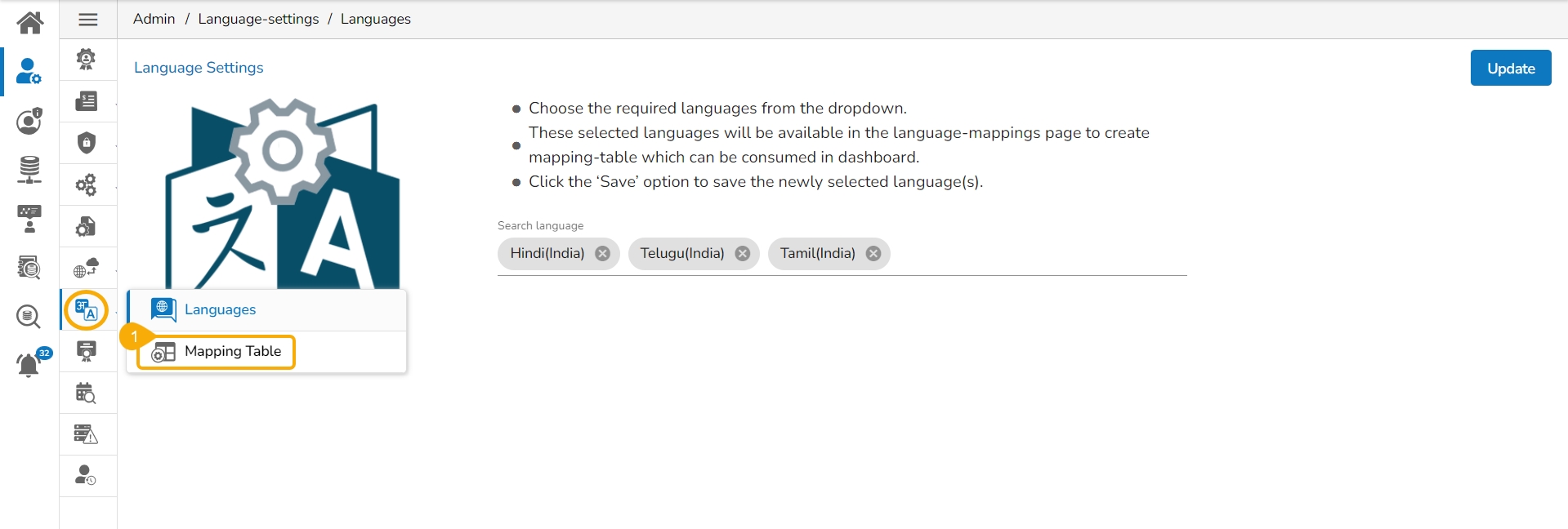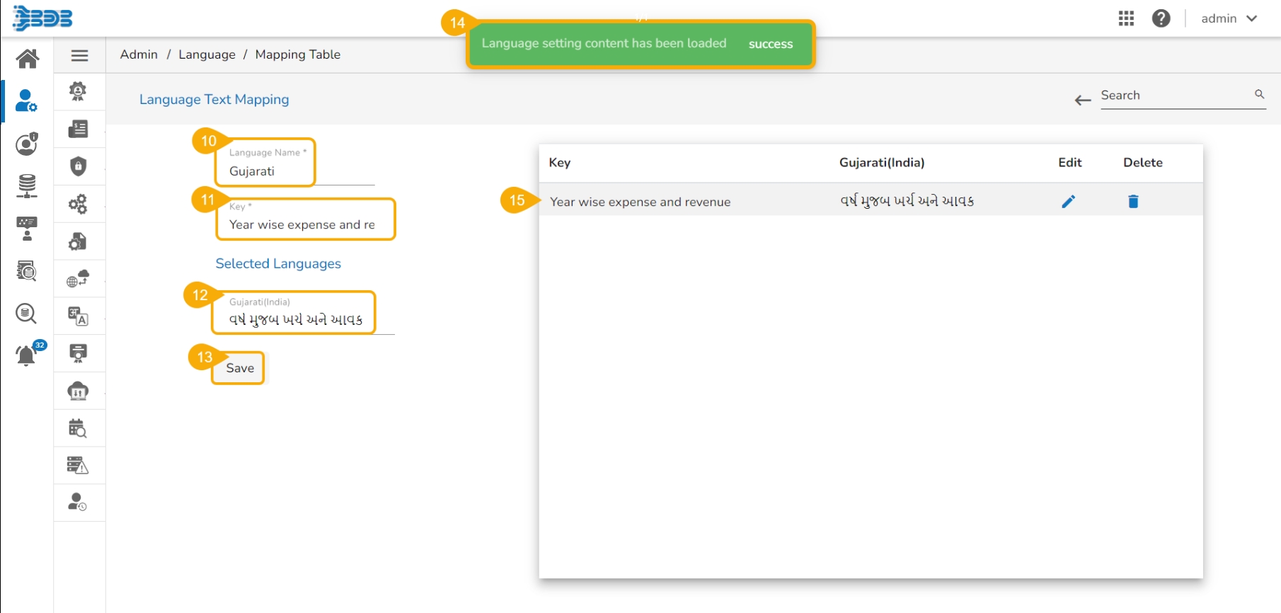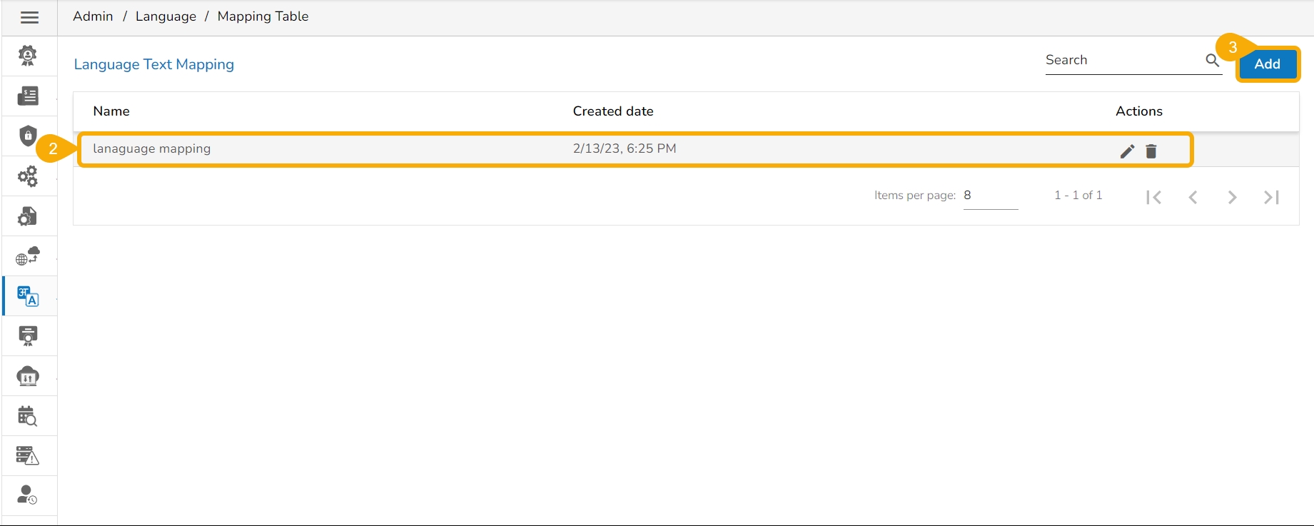 The Language Text Mapping page opens, from where the administrator can add various key terms and their synonyms to the newly created language.