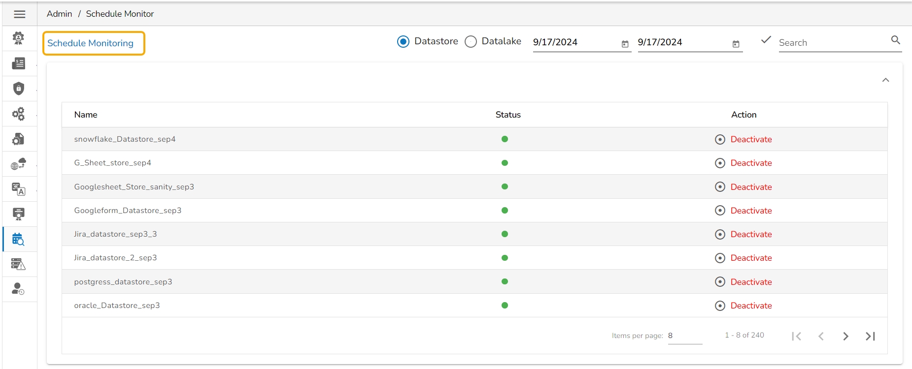 The Schedule Monitoring page appears with a list of data stores displaying their current Status and Action.