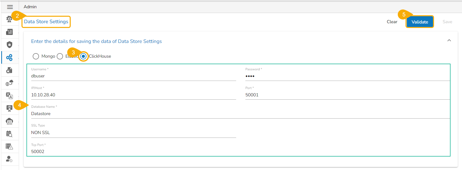## **Configuring Data Store with ClickHouse as selected DB**&#x20;