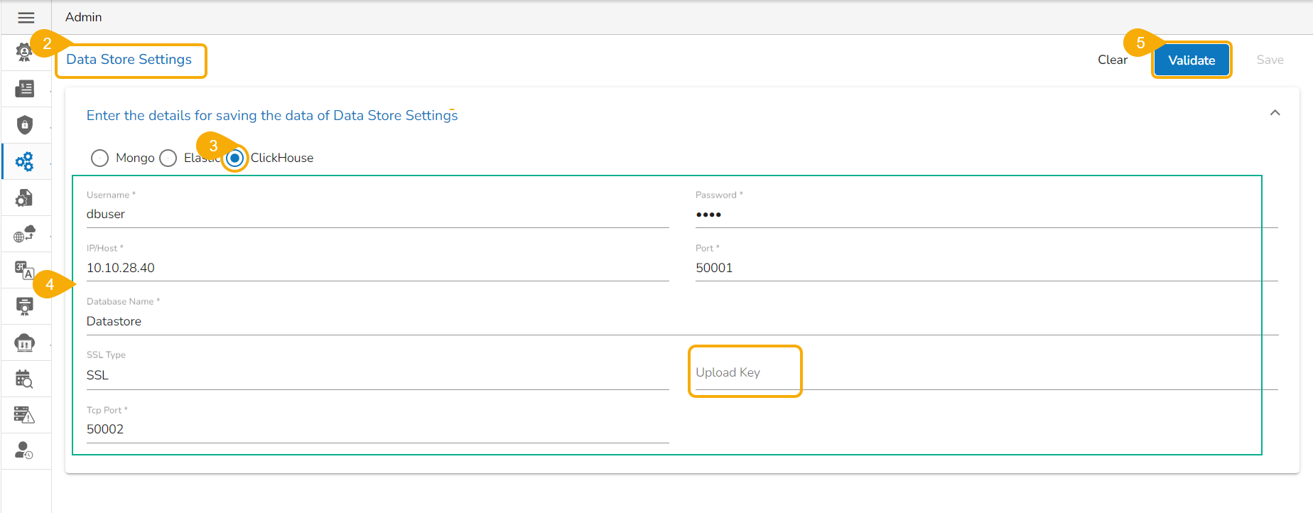 *<mark style="color:green;">Please Note</mark>: The user needs to provide the **Upload Key*** ***while configuring the Data Store Settings with SSL** for the ClickHouse database.*
