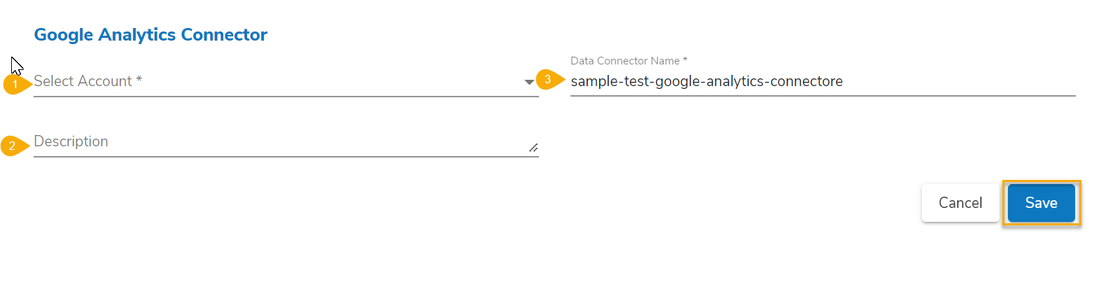 *<mark style="color:green;">Please Note:</mark> The below-given page opens if the user selects an account using the **Select Account** drop-down menu. In this scenario, the user needs to provide only the Data Connector name, Description (optional) and click the **Save** option to create a new Google Analytics Data Connector.*