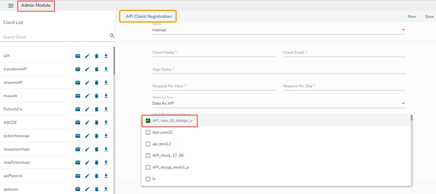 The Data Set published as a data service appears under the drop-down menu of the API Client Registration form (as displayed in the below-given image).
