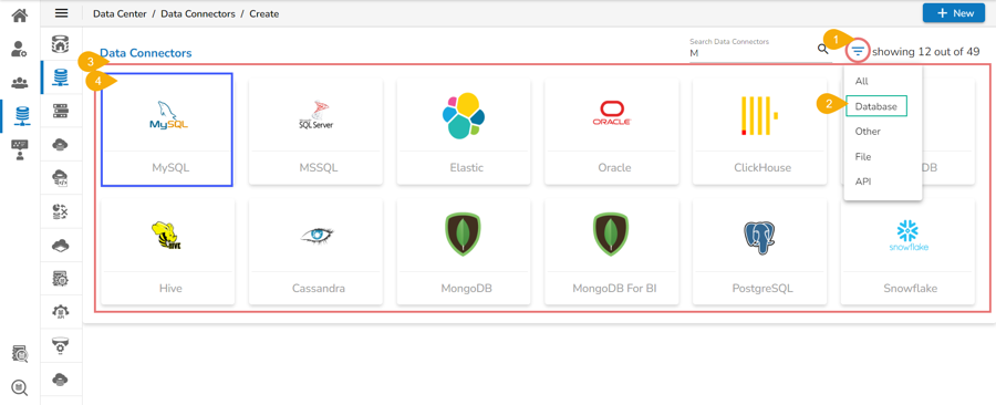 The Data Connectors page gets customized based on the selected category (E.g., the following image displays all the available data connectors from the Database category).
