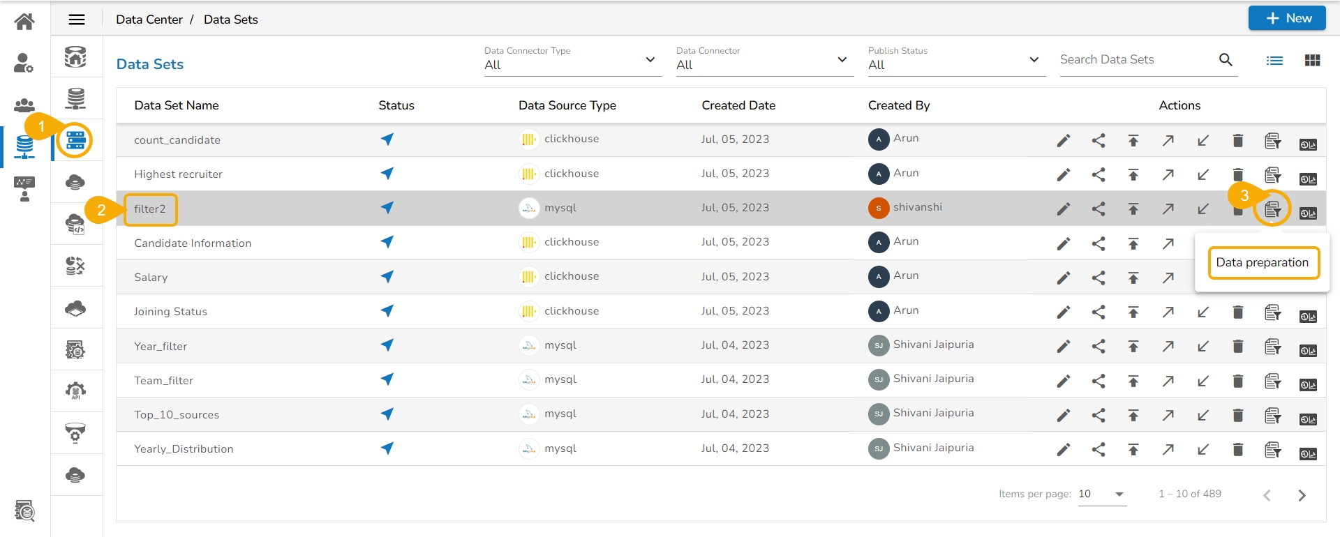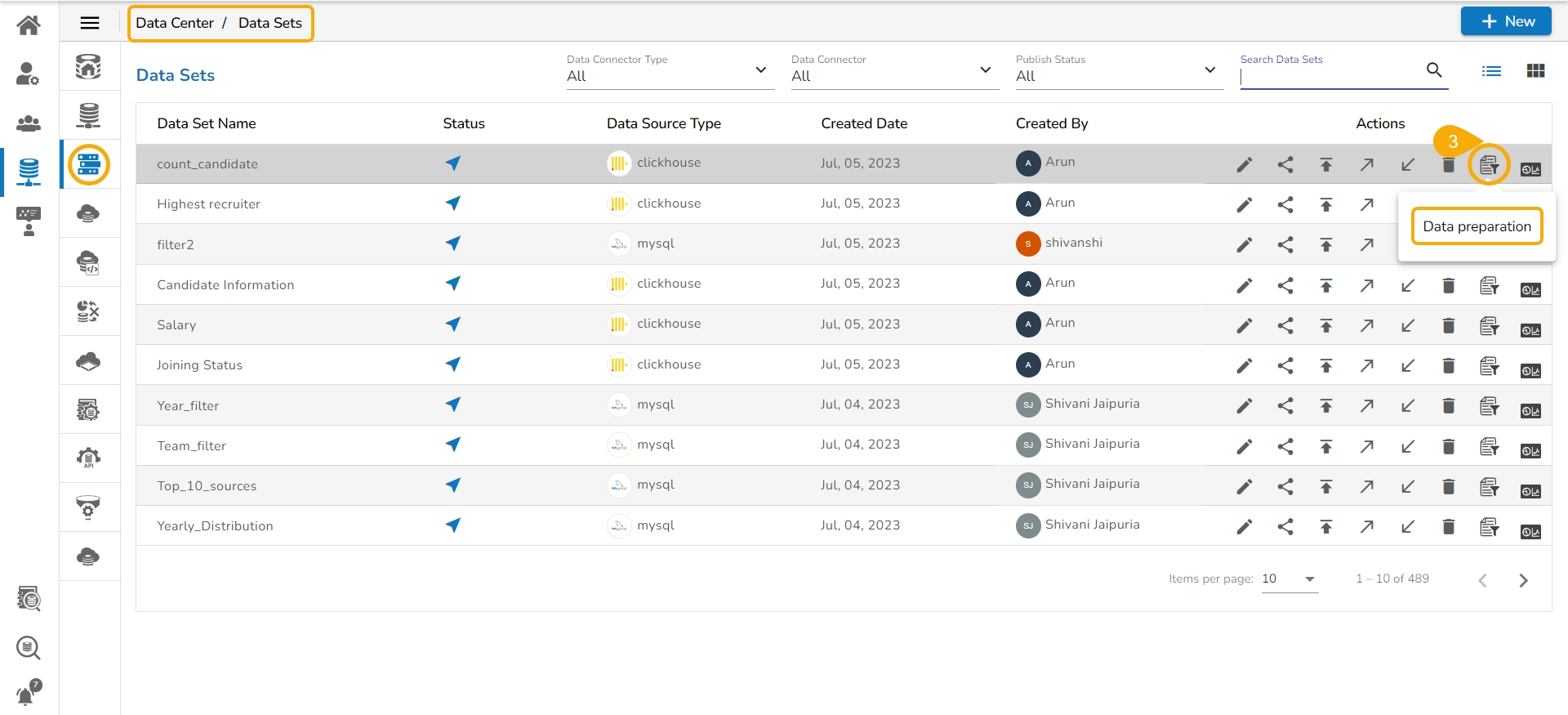Data Preparation icon on the Data Sets List page