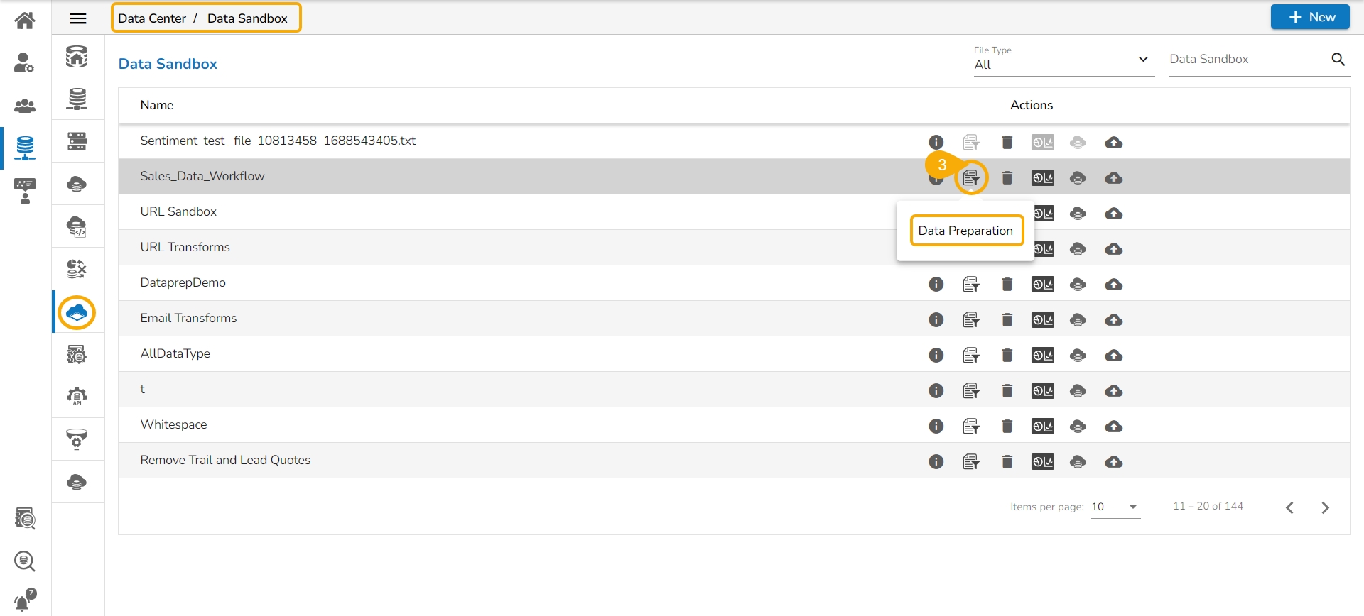 Data Preparation icon on the Data Sandbox List page