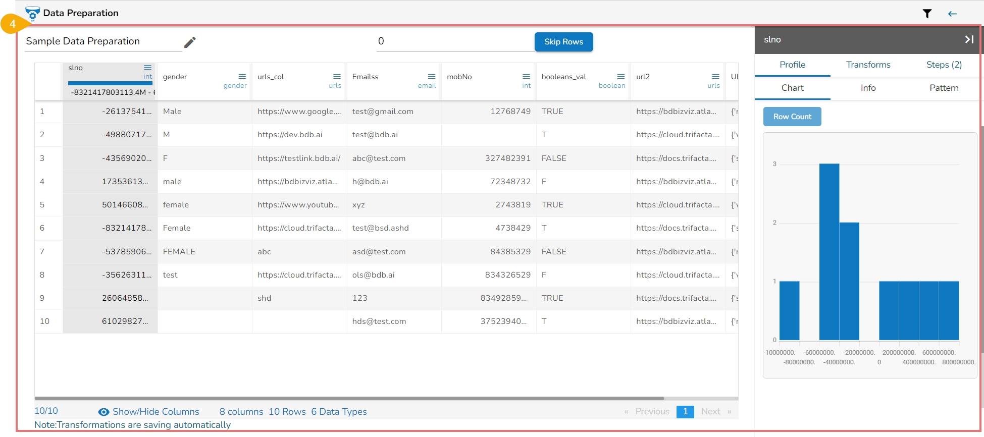 The user gets redirected to the Data Preparation workspace for the selected Data Preparation.(The user can view the steps and perform more transforms on the selected Data Preparation by using the Data Preparation workspace.)