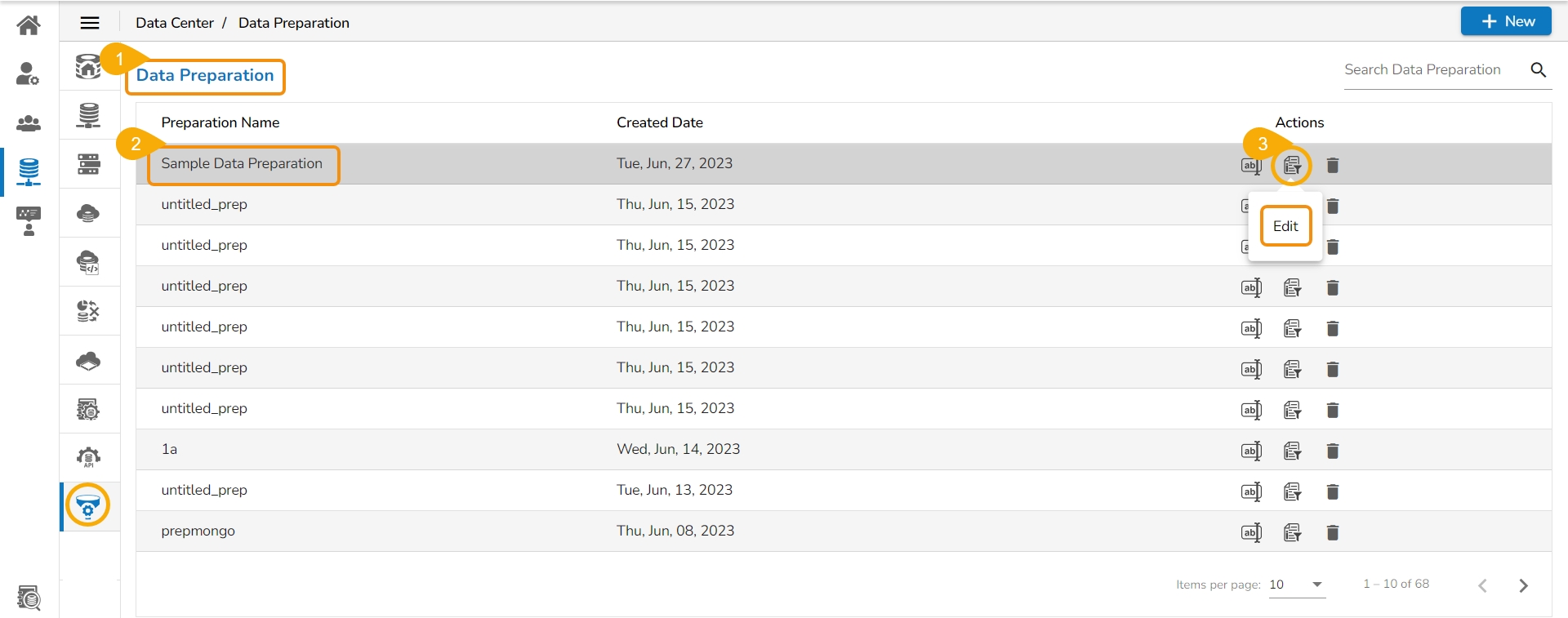 The user can open any of the saved Data Preparation using this option and modify the data set as needed.