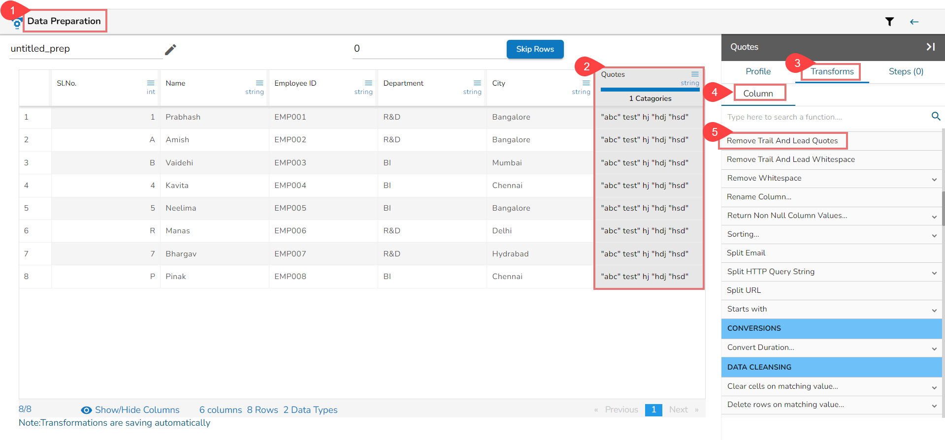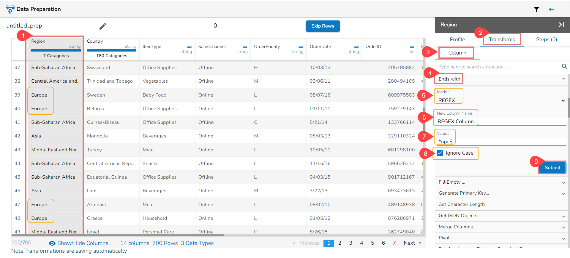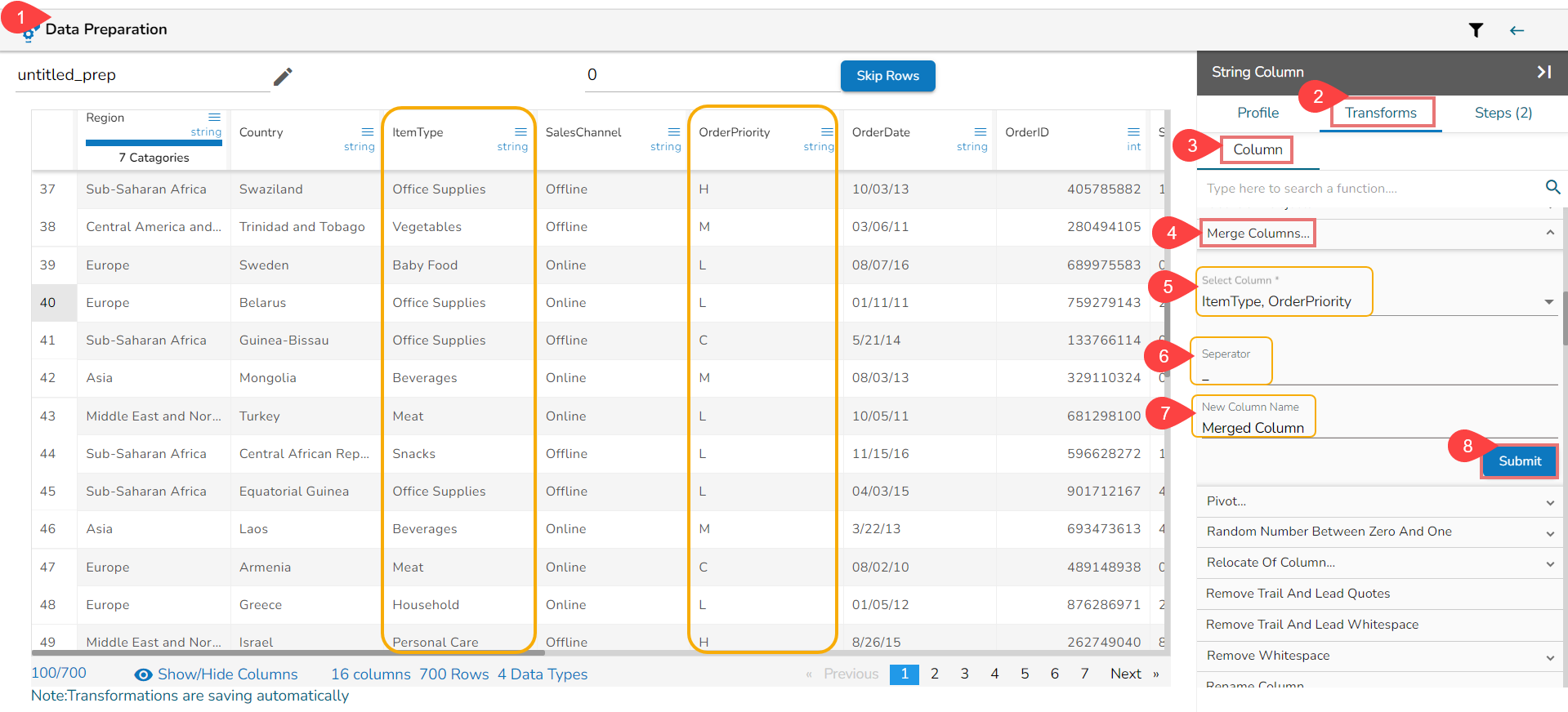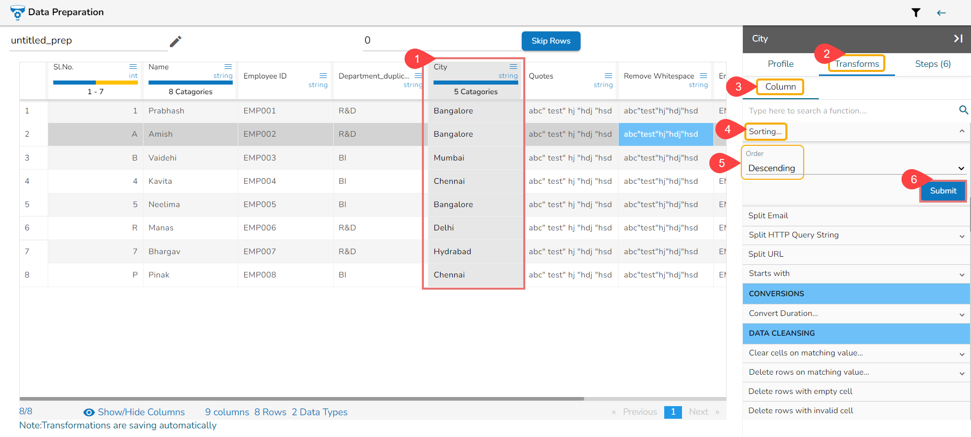 The Sorting transformation helps to sort the column in Ascending/ Descending order for the ease of the user in data preparation. There are two options are given: