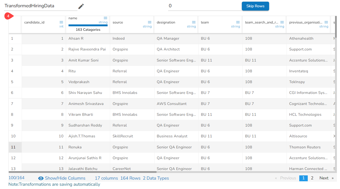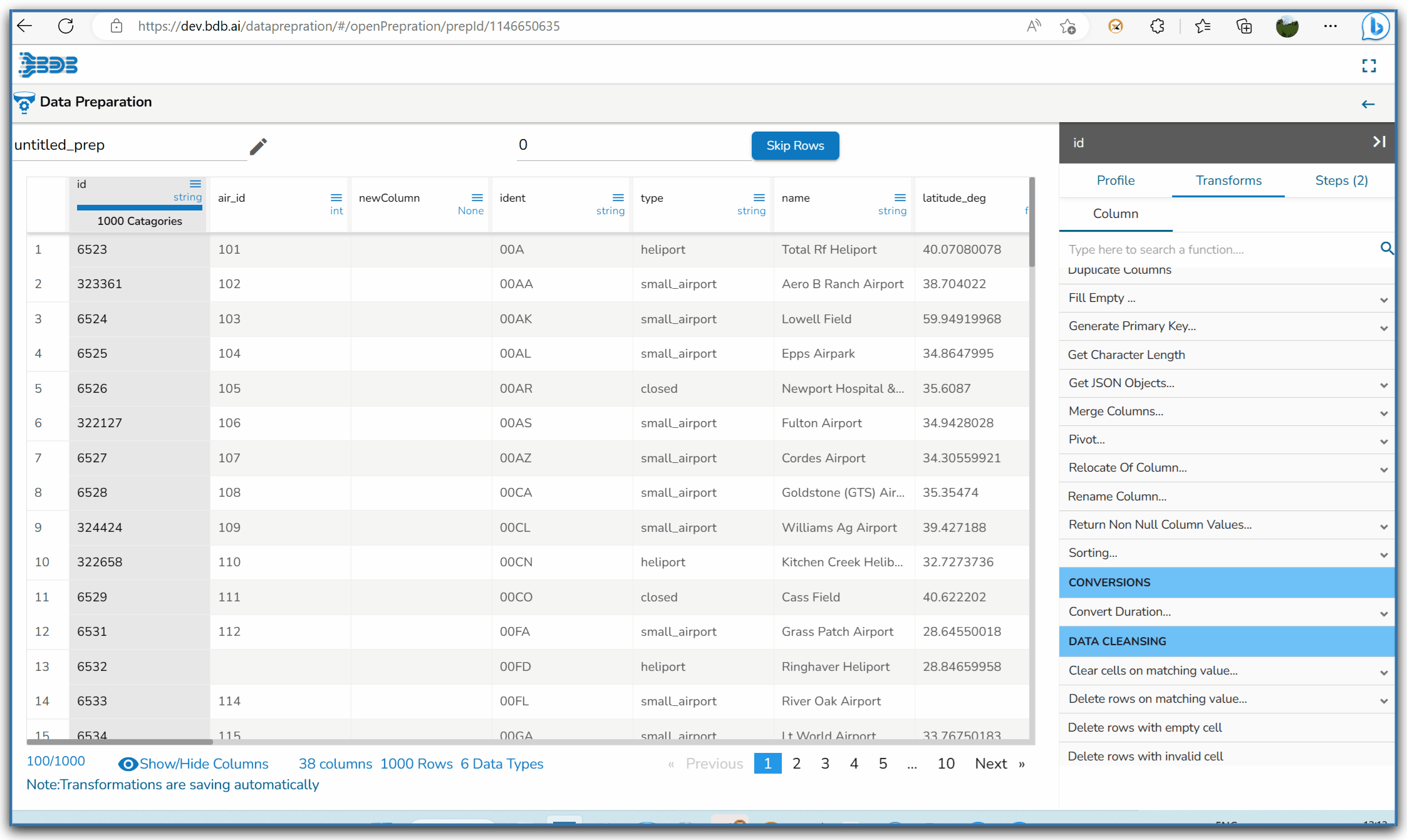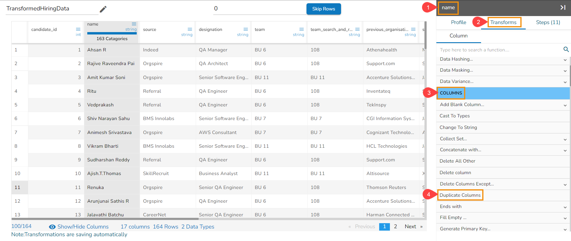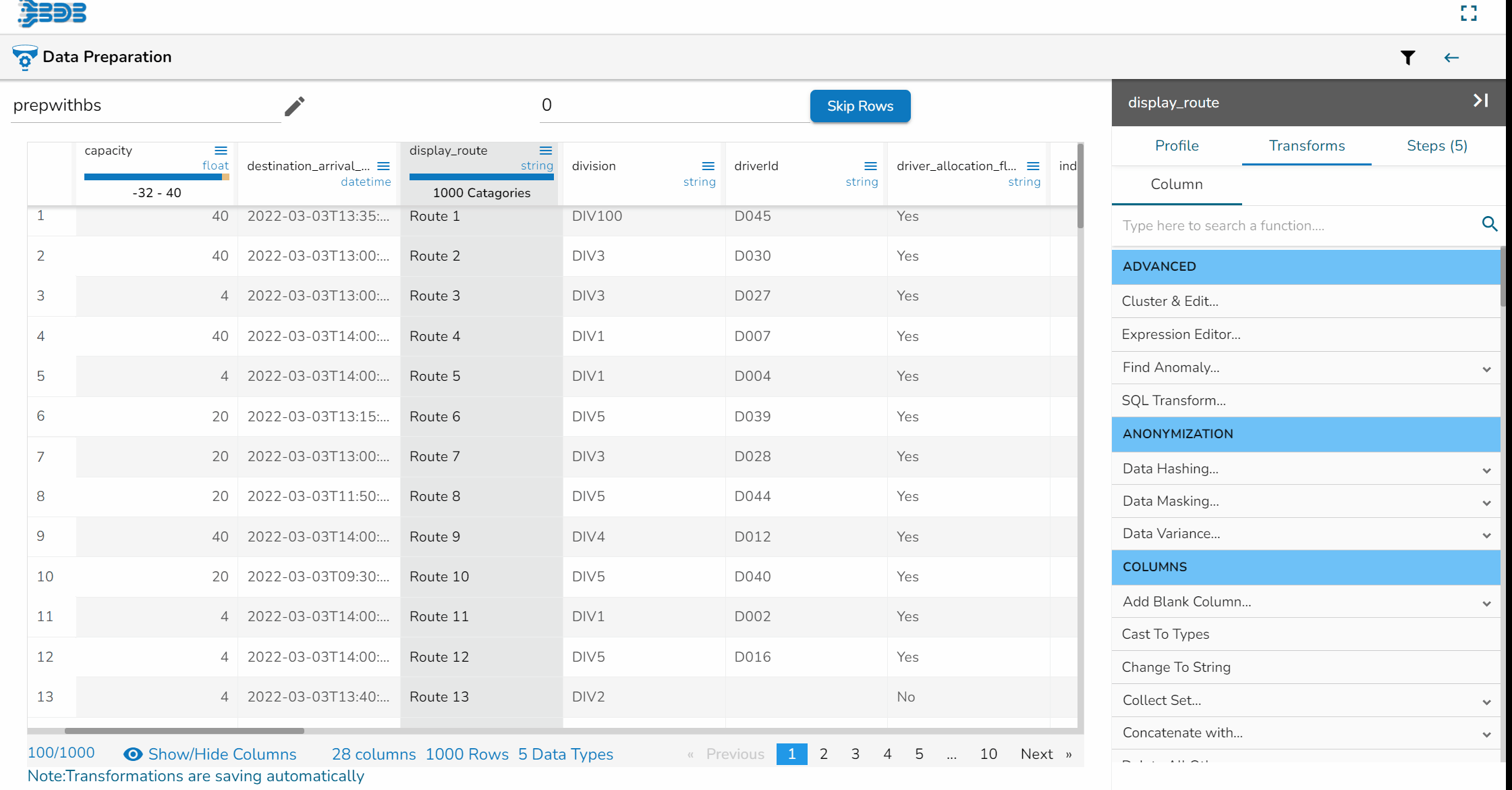 The Sorting transformation helps to sort the column in Ascending/ Descending order for the ease of the user in data preparation. There are two options are given: