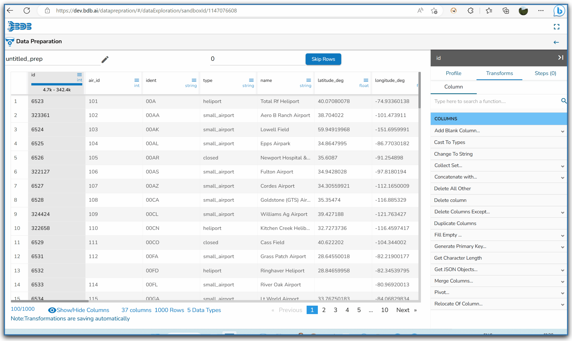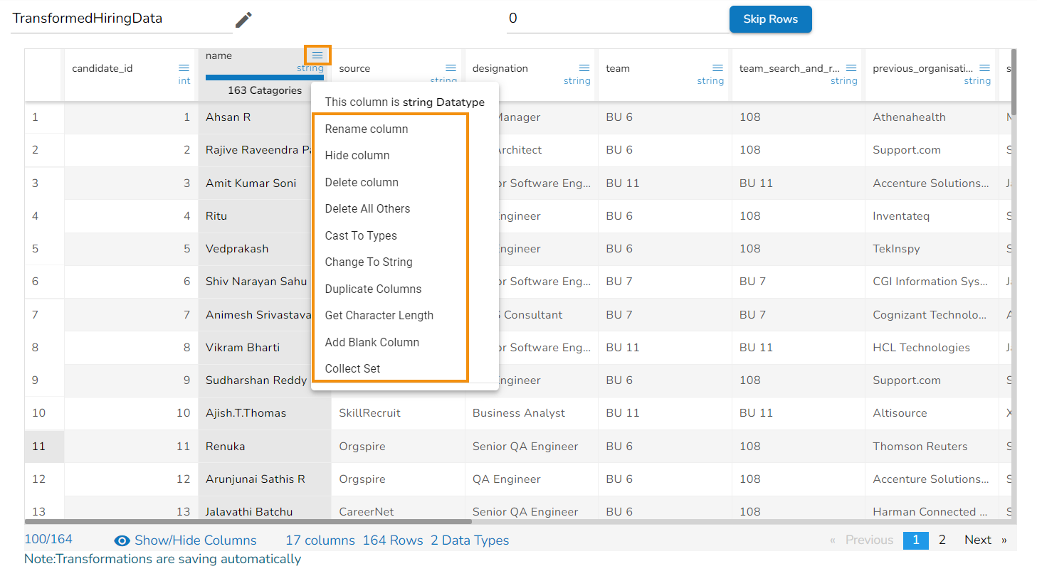 Some of the Column transforms can be accessed by using the ***Menu*** ![](https://content.gitbook.com/content/j2SqA9Ec9HkYsyrU85qy/blobs/Fk1y1ju7khKYMXDzunE6/image.png) icon provided for each column in the Data Grid display of the dataset.​​**​**