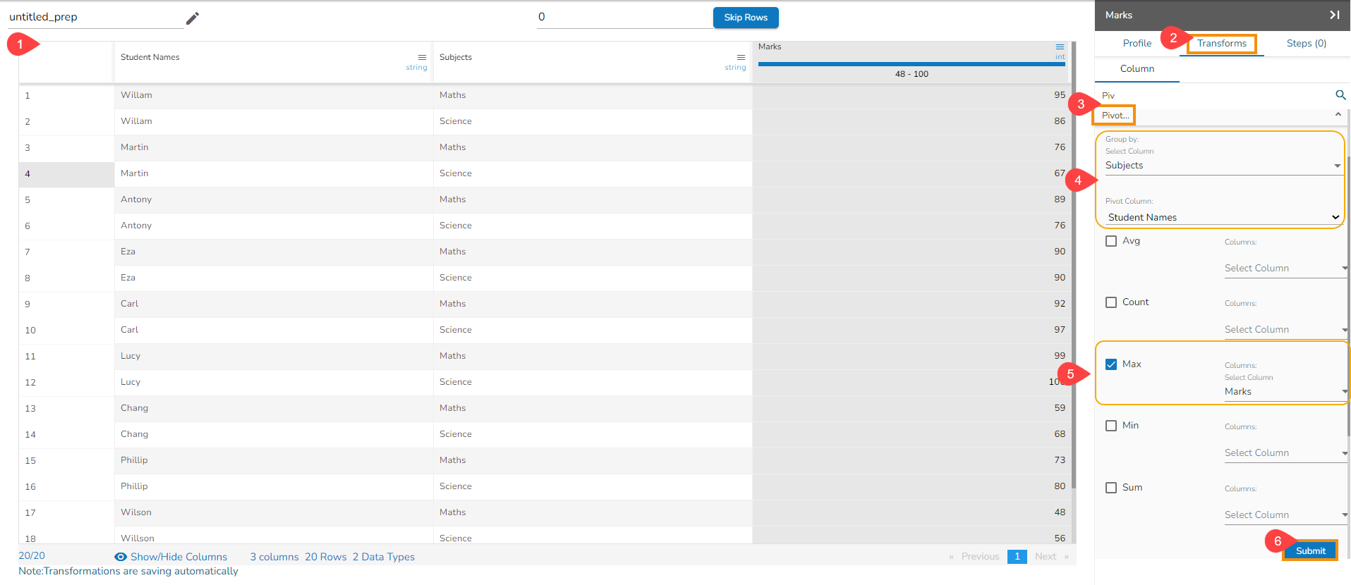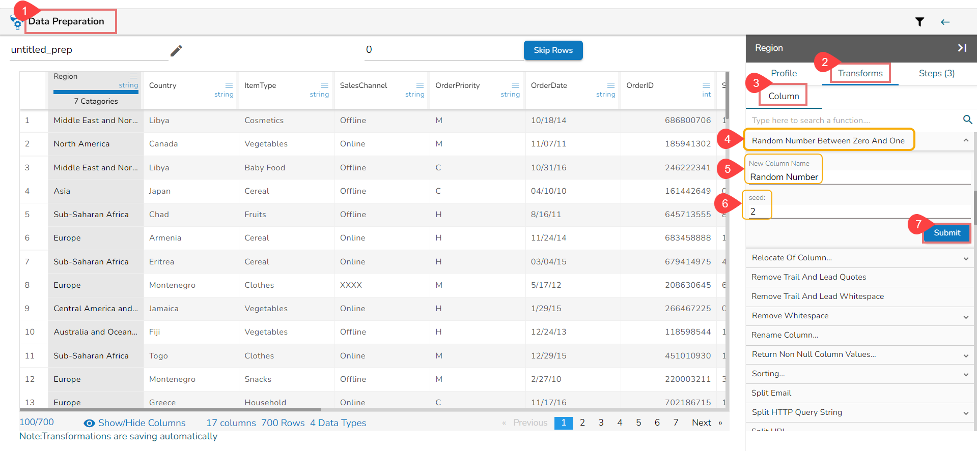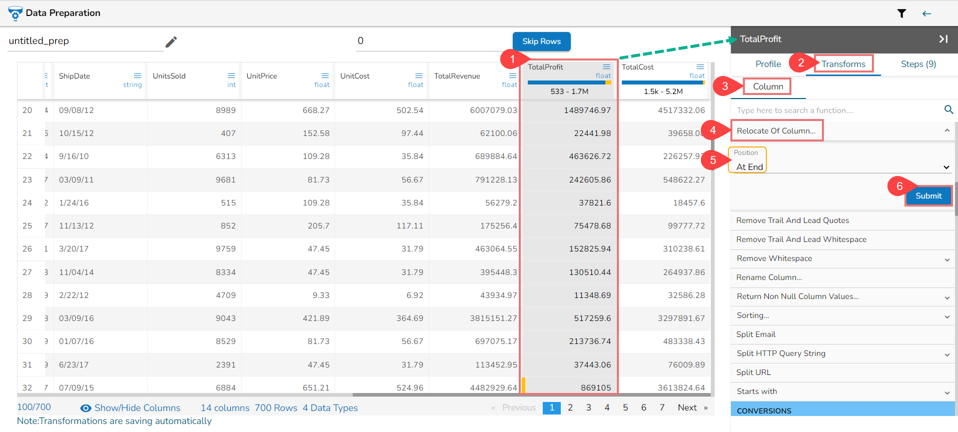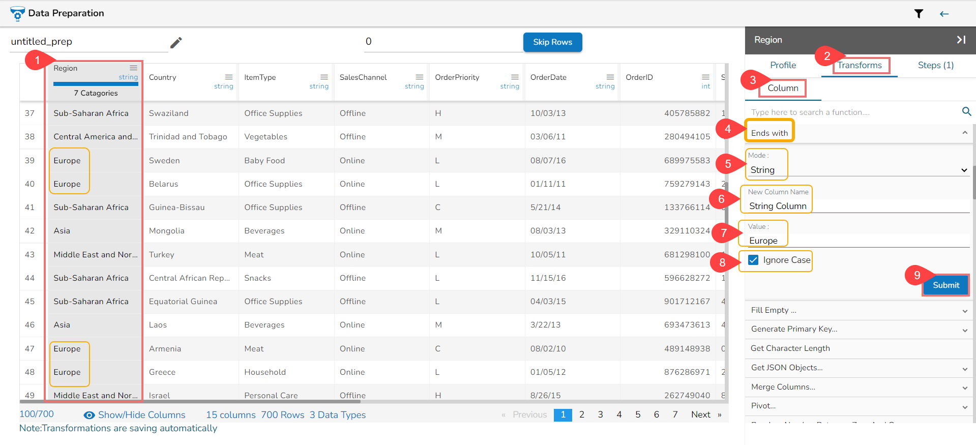 *<mark style="color:green;">Please Note:</mark> If the Sorting transform is used multiple time, the dataset will be ordered based on the last selected sorting order.*&#x20;