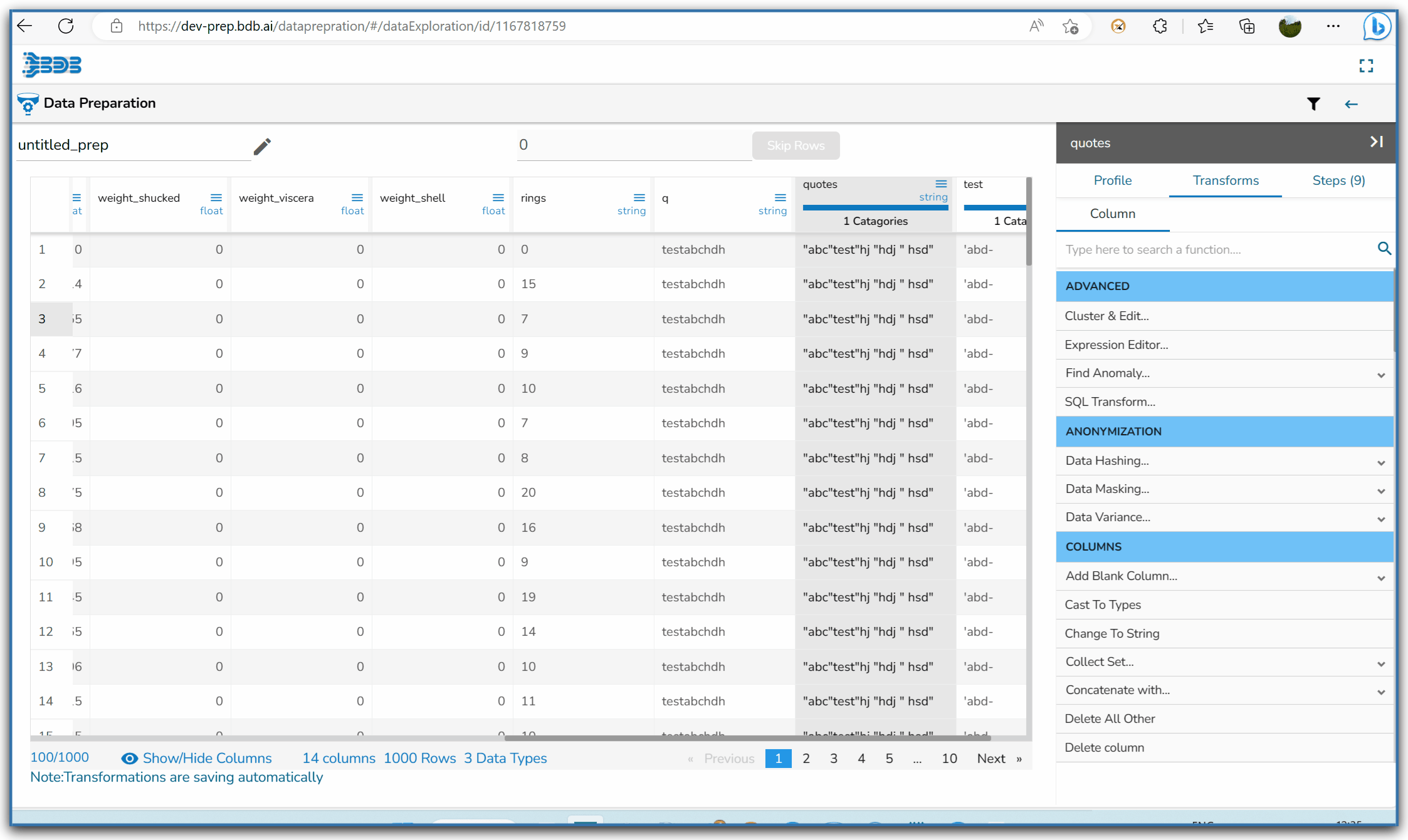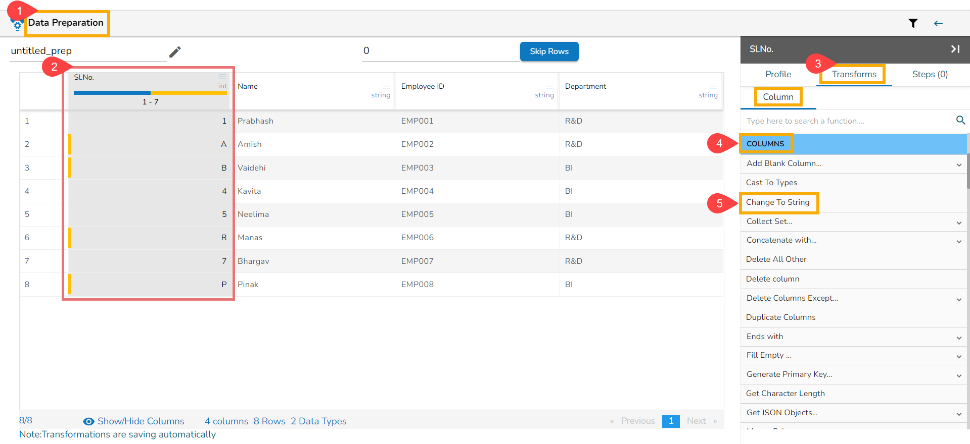 * *The **Change To String** transform can also be accessed by using the menu icon provided for the each column in the Data Grid display of the dataset.*&#x20;