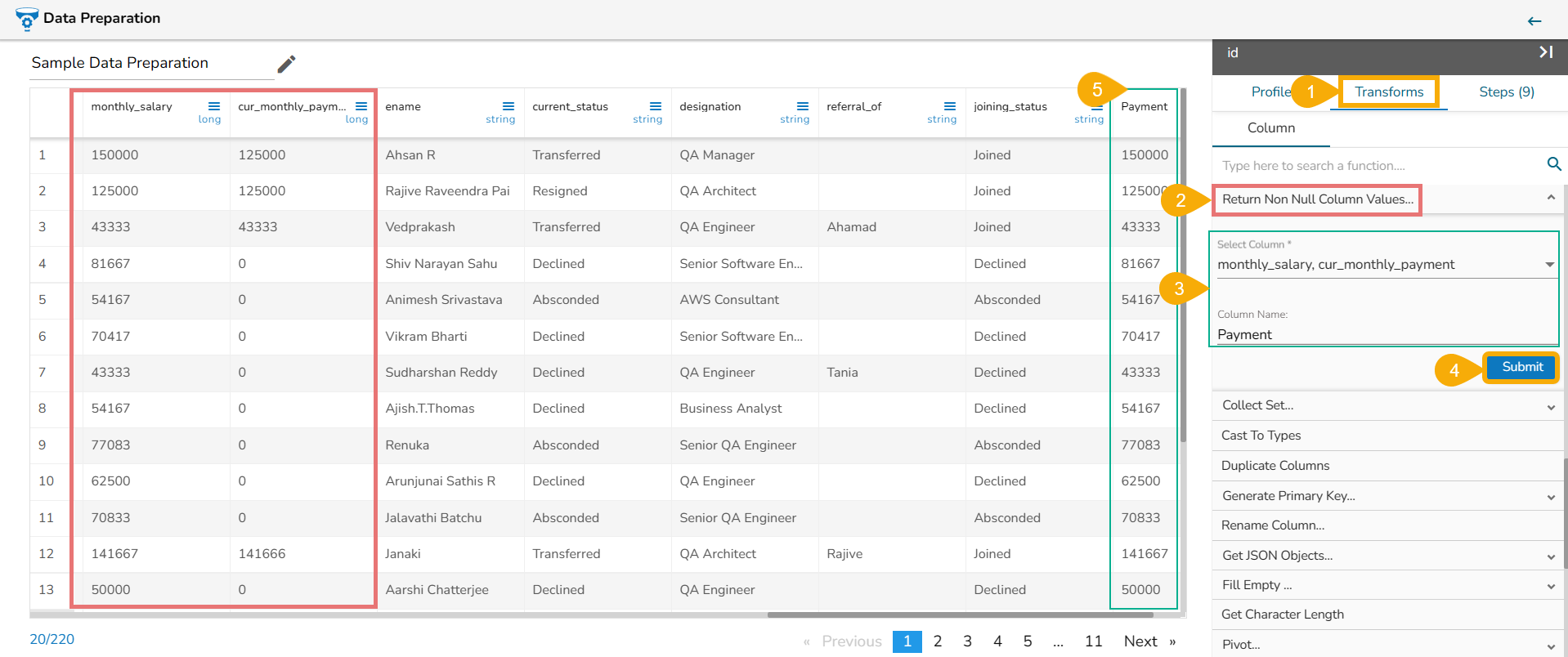 The Return Non Null Column Values transform has been applied to the ***monthly\_salary*** and ***cur\_monthly\_payment*** columns. As a result, the ***Payment*** column gets added to the dataset with the values based on the applied transform.
