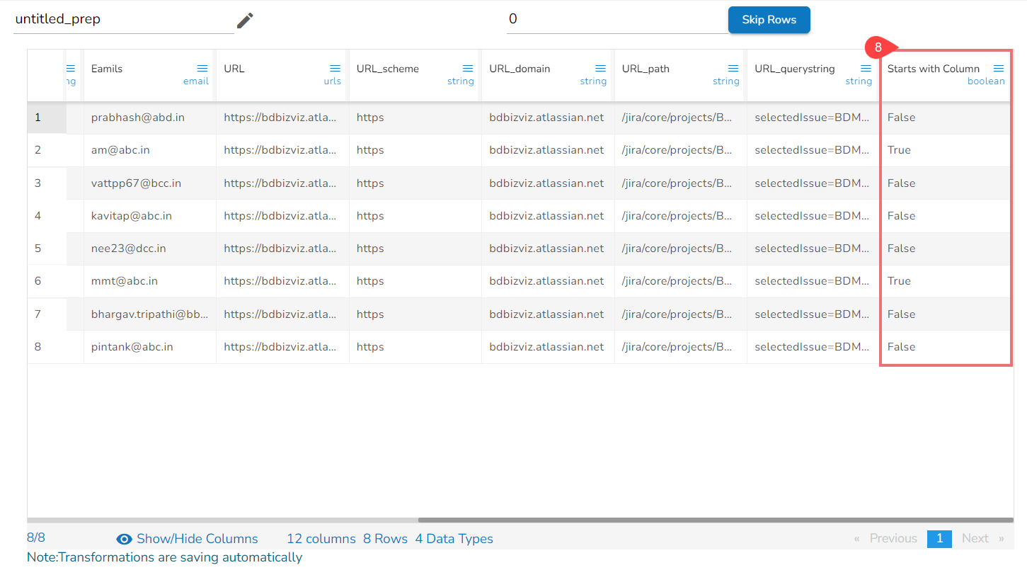 * Result will come as ***True*** or ***False*** for a single column after checking whether the configured words come in the beginning of the concerned row of the selected column.