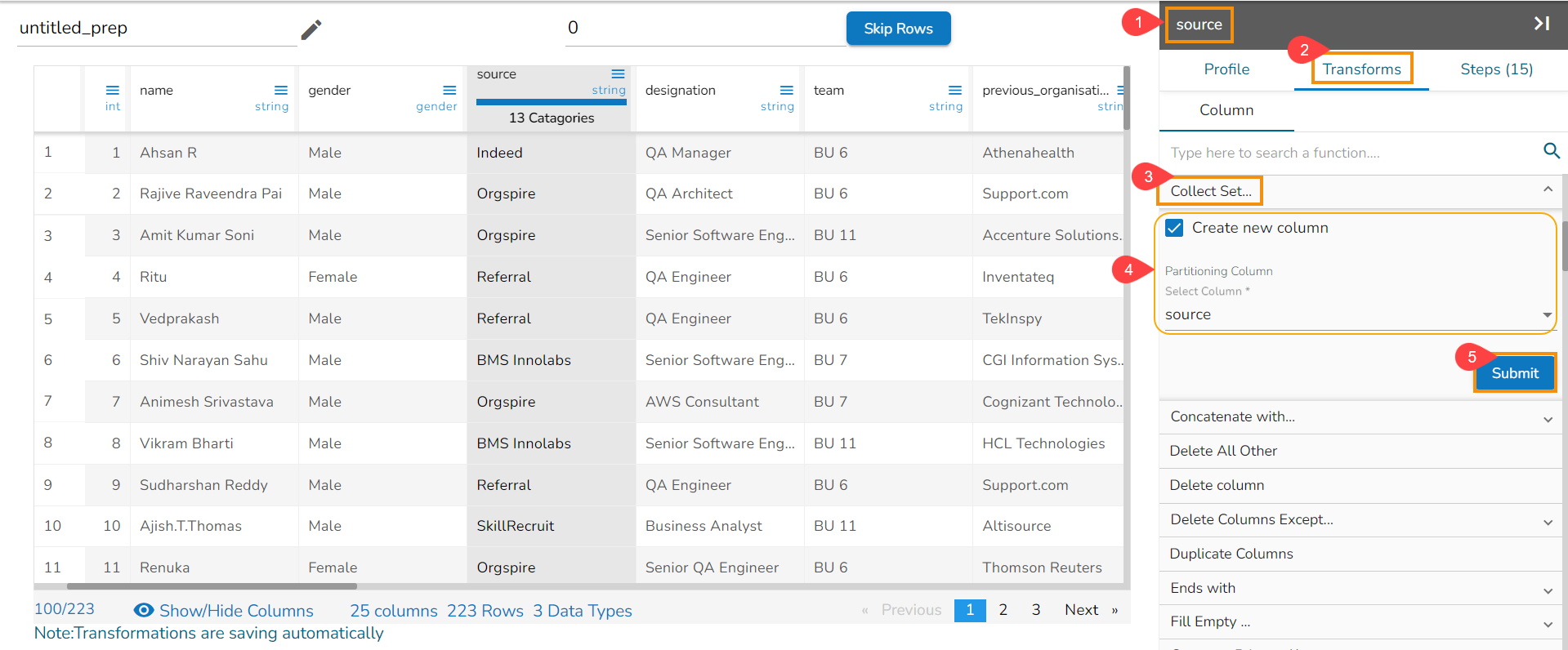 <figure><img src="https://content.gitbook.com/content/j2SqA9Ec9HkYsyrU85qy/blobs/I5ZBMbG9UlwP5UvHAYT9/image.png" alt=""><figcaption><p><em><strong>Applying the Collect Set transform on the Source column</strong></em></p></figcaption></figure>