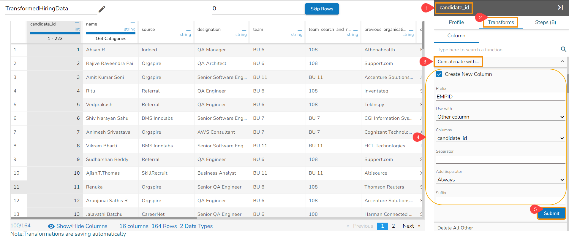 The users can concatenate a column value with some other column or with some prefix/suffix. To perform the transform, select the column to which data must be concatenated and select the ***Concatenate with*** transform. The available options are: