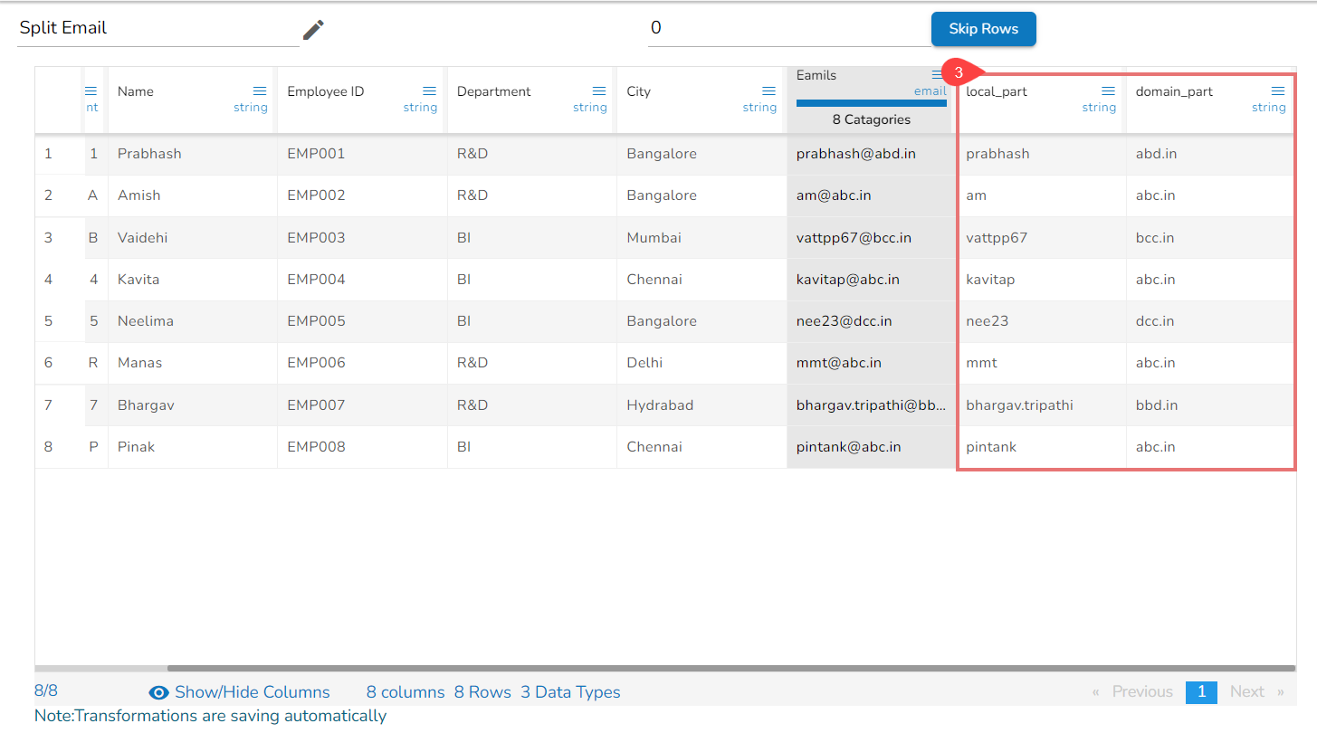 * It will create two new columns as ***local\_part*** and ***domain\_part.***