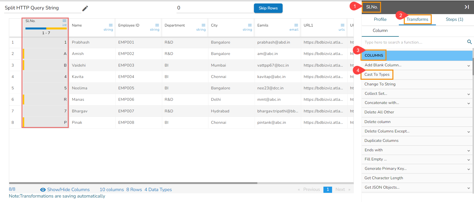 * Click on the ***Cast to Types*** transform from the ***COLUMNS*** category of transforms.