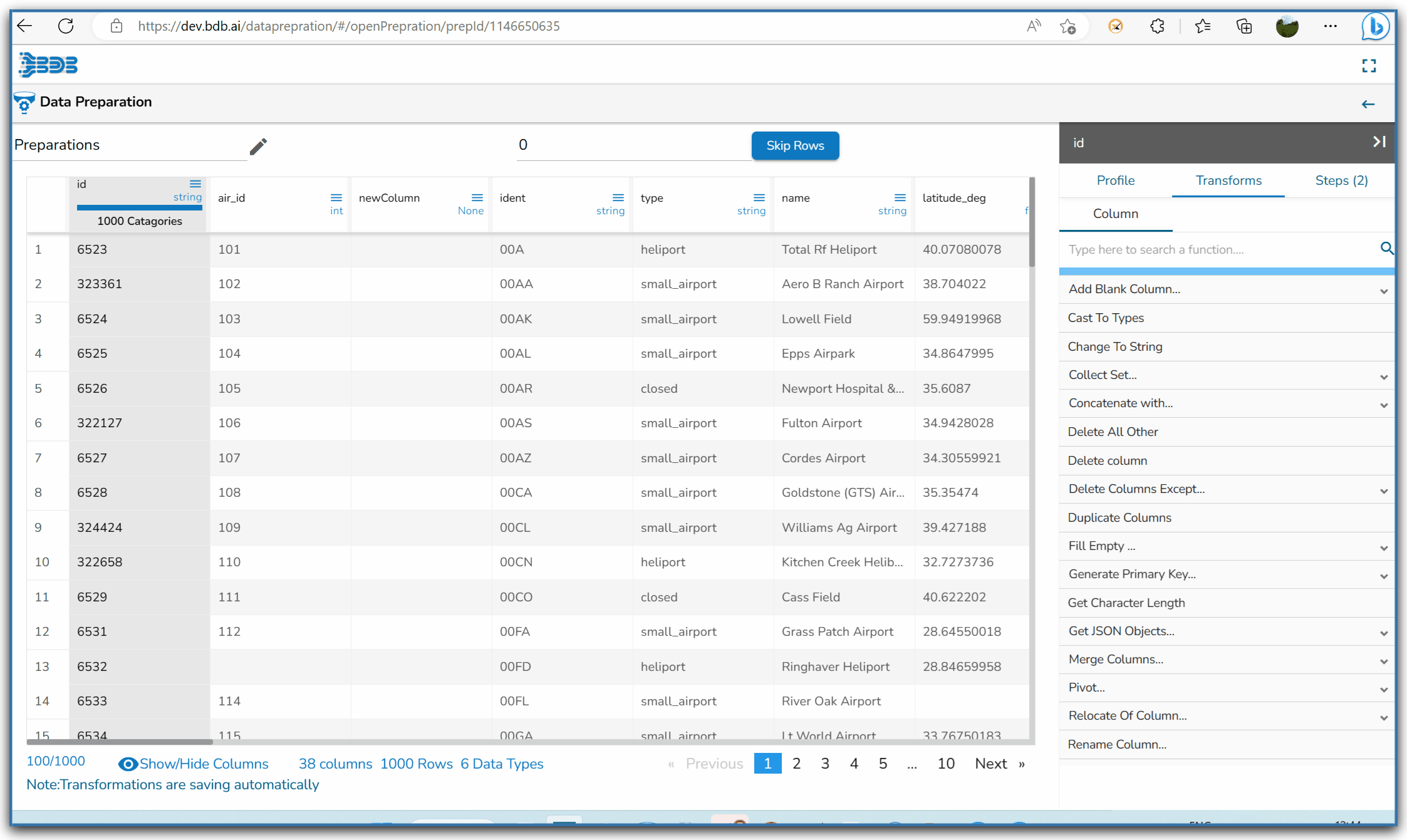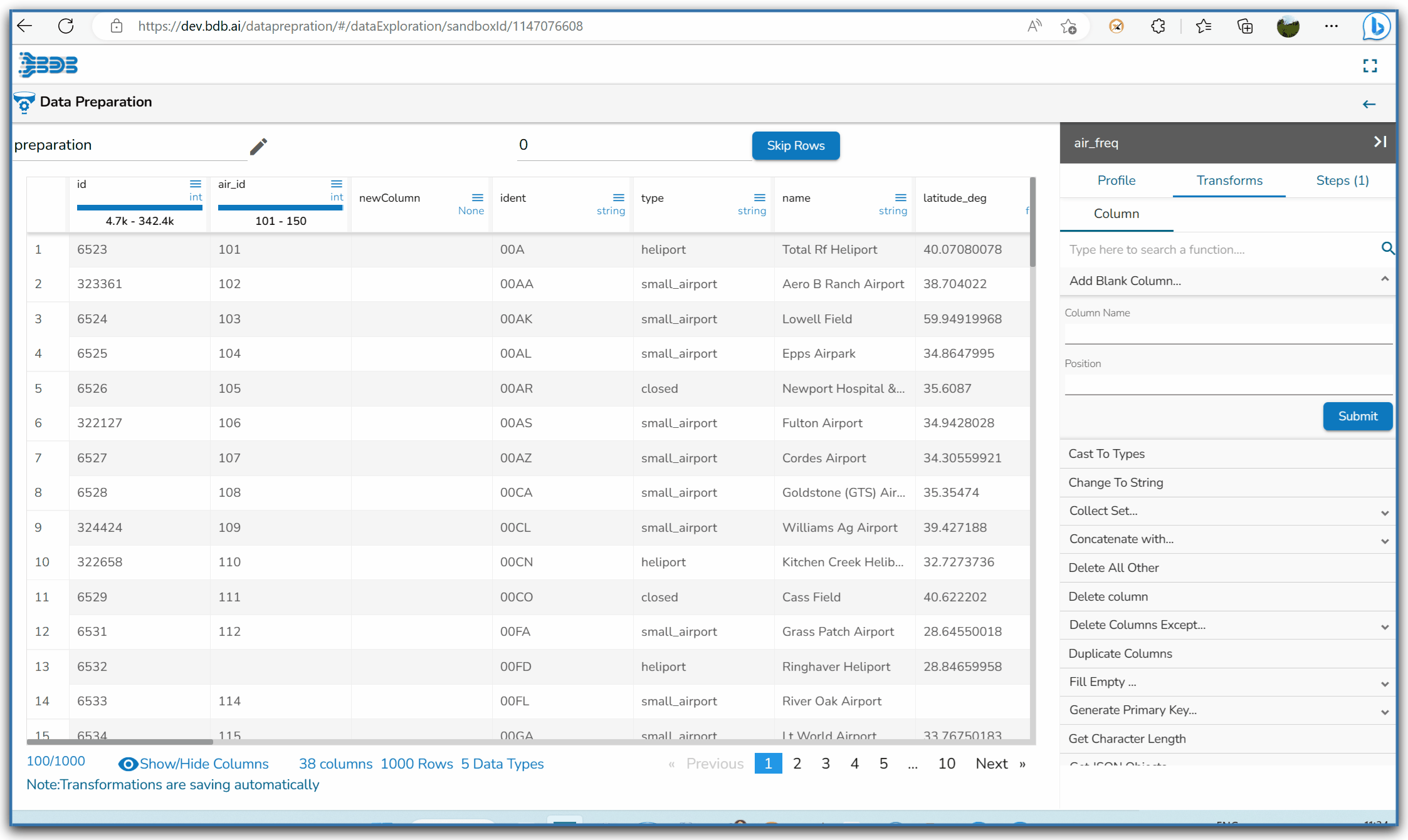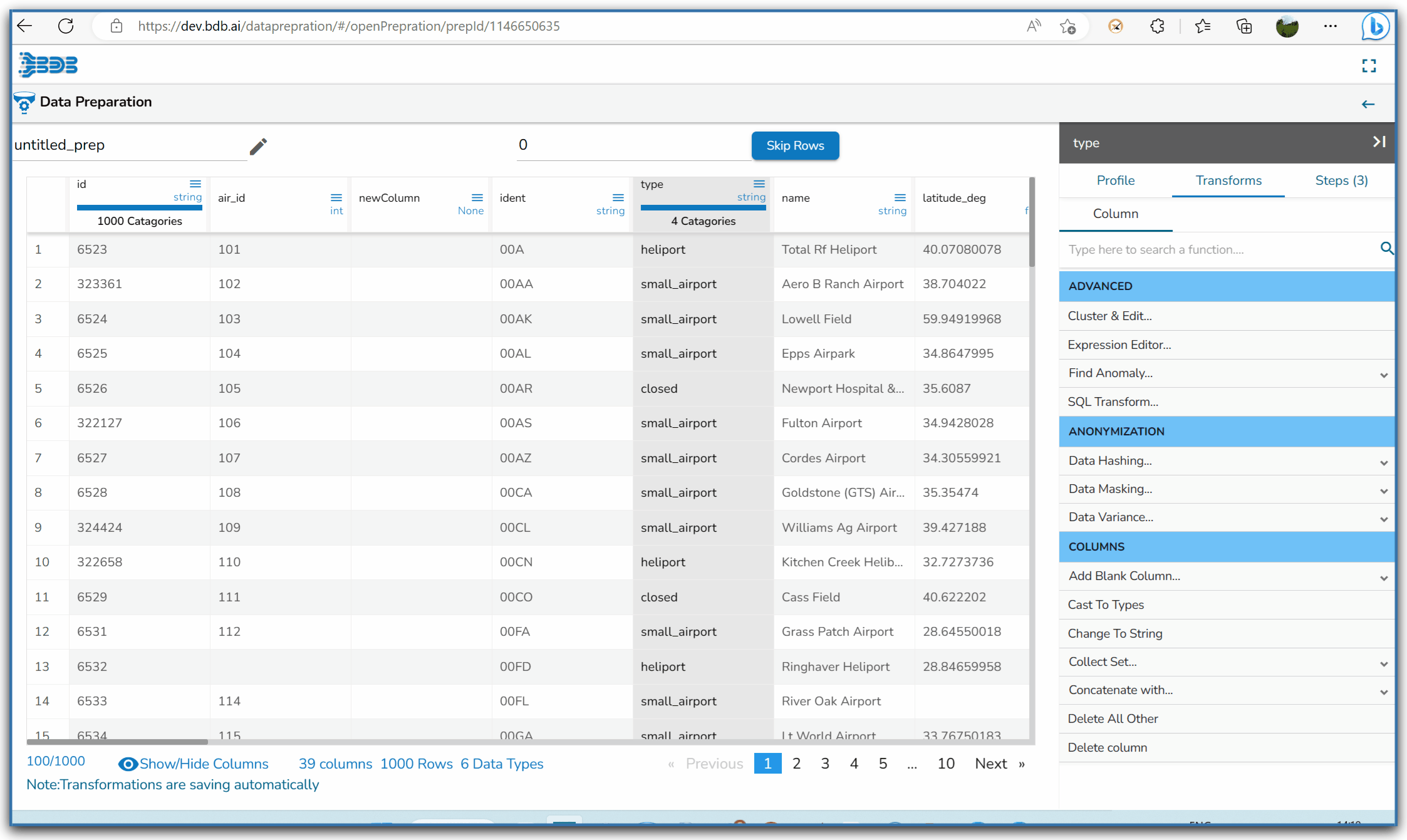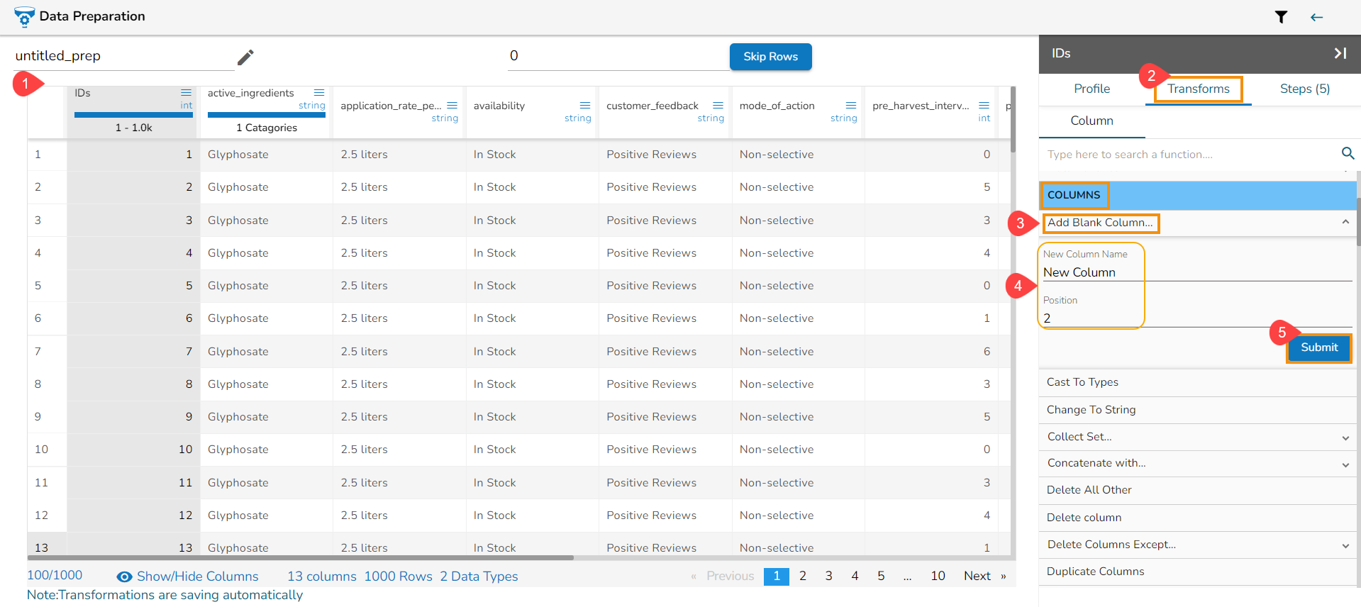 This transform will create a new blank column in the selected data set. The datatype for the newly added blank column will be as None.&#x20;