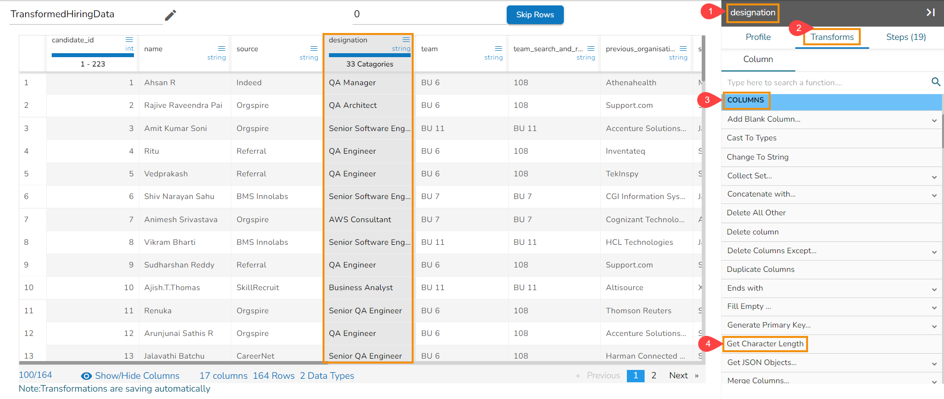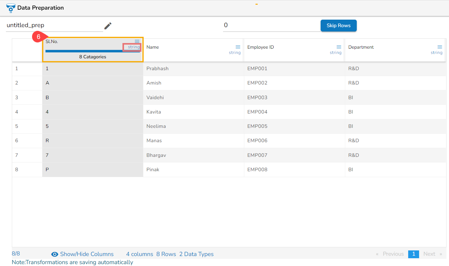 <figure><img src="https://content.gitbook.com/content/j2SqA9Ec9HkYsyrU85qy/blobs/eYGTsWeFrbRNtGha1qdF/image.png" alt=""><figcaption><p><em><strong>Data Type of the selected column gets changed as String</strong></em></p></figcaption></figure>