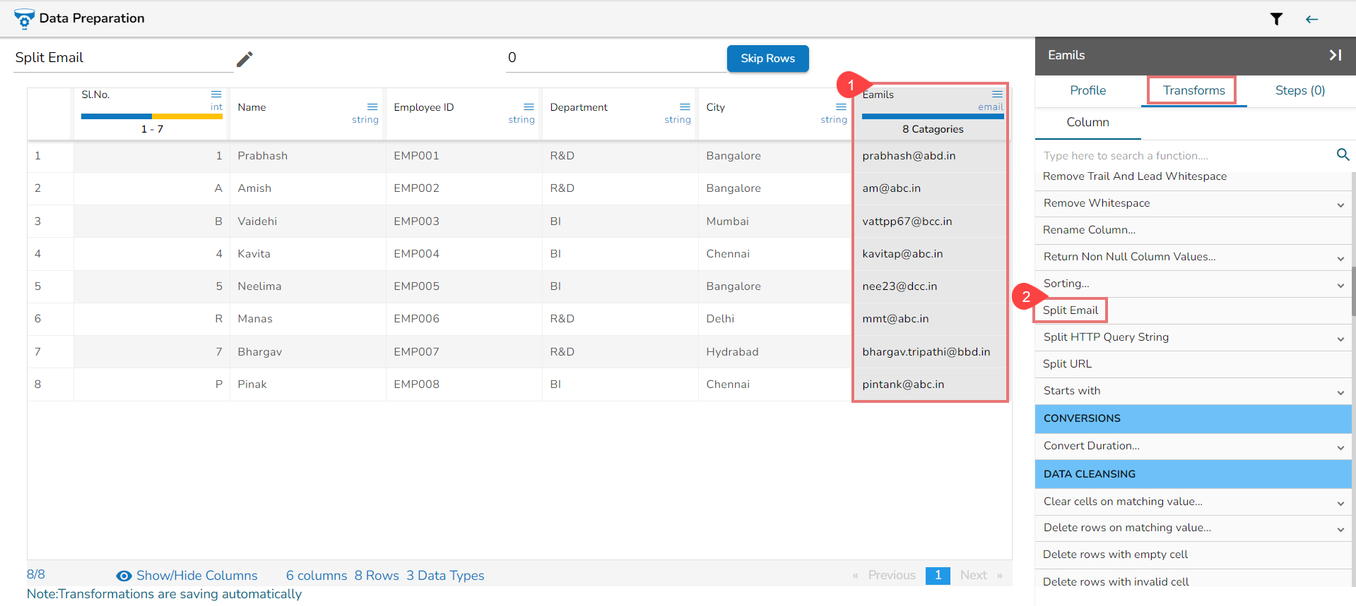 <figure><img src="https://content.gitbook.com/content/j2SqA9Ec9HkYsyrU85qy/blobs/pnLclJvNYphbyWUWeJKN/split_email.gif" alt=""><figcaption><p><em><strong>Using the Split Email transform</strong></em></p></figcaption></figure>